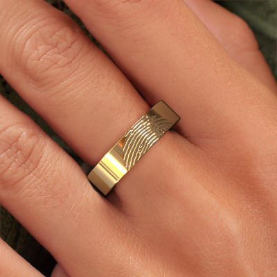 Wat is er unieker dan een vingerafdruk? Daarom is deze gouden dames trouwring ook zo bijzonder. De eigen afdruk van je geliefde, gegraveerd in het symbool van jullie eeuwige liefde voor elkaar. Hoe mooi is dat om deze trendy trouwring om de vinger van je partner te schuiven op jullie huwelijksdag? Hoe het werkt? Je besteld eerst de trouwring zoals je hem wilt hebben. Nadat je hem besteld hebt, stuur je ons een email met de vingerafdruk. Hoe je die maakt, kun je lezen onderaan deze pagina in onze kennisbank. De breedte van deze Bernice trouwring is ±5 mm. In ons gespecialiseerde team verwerkt de sieradenontwerper jouw trouwring tot een 3D ontwerp. Wanneer je wilt, kun je hier ook een dummy van bestellen, zodat je de trouwring al van tevoren kunt zien en passen. Onze goudsmid werkt vervolgens in ons atelier met de hand om heel nauwkeurig jouw unieke ring te vervaardigen. Een heel secuur werkje, zowel het vervaardigen als de afwerking vragen een scherp oog. En dat is het mooie van het vak, want uiteindelijk is jouw unieke trouwring het resultaat van een echt ambacht, dat met veel passie uitgevoerd wordt!Laat je gerust inspireren door onze modellen. Je kunt deze trouwring ook nog verder aanpassen: breder of smaller, glimmend of juist mat? Geen probleem! Ook als je zelf ideeën hebt voor bijzondere trouwringen, staan onze sieradenontwerpers graag voor je klaar om je droomring verder uit te werken. Neem gerust met ons contact op!Door de modernste technieken, gecombineerd met ambachtelijk handwerk, kunnen wij je trouwringen leveren voor een prijs die altijd 30% goedkoper is. Ook doordat we alle trouwringen zelf gaan maken, zodra een bestelling komt, hebben we geen dure voorraden en kunnen we daardoor jou de beste prijsgarantie geven, voor juwelierskwaliteit!Om het voor jou makkelijker te maken kun je ieder besteld sieraad binnen 30 dagen na aflevering eenvoudig weer retour sturen.