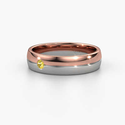 Wat een prachtige combinatie van twee edelmetalen, die elkaar zo mooi versterken in de moderne vormgeving van deze ring! Onze goudsmid vindt het bijzonder om voor jou een unieke trouwring te vervaardigen, die jij zelf hebt samengesteld. Elke dames trouwring die wij leveren is in ons eigen atelier ambachtelijk met de hand gemaakt. Hierdoor is het mogelijk om al je wensen te verwezenlijken in jouw persoonlijke ring, die bij jouw stijl past. In deze moderne WH0201L25APM trouwring is ronde gele saffier geplaatst, hij is ±5 mm breed en heeft een mat/glimmende afwerking. U kunt deze dames trouwring zelf samenstellen in verschillende edelmetaal combinaties, deze heeft de combinatie 14 Carat rosé goud met witgoud. Met behulp van onze configurator kun je de trouwring in verschillende edelmetalen en kleuren samenstellen. Onze sieradenontwerpers zetten je ontwerp vervolgens om in een 3D ontwerp, zodat je precies kunt zien hoe je sieraad eruit komt te zien. Onze goudsmeden vervaardigen daarna je trouwring met de hand, volgens de oude ambachten. Het is namelijk onze uitdaging om precies die trouwring te vervaardigen die jij in gedachten hebt. Een unieke trouwring die helemaal bij jullie stijl past!Je kunt je trouwens ook laten inspireren door deze trouwring en de ring nog verder naar smaak aanpassen. Wil je bijvoorbeeld liever een bredere of smallere ring of een glimmende of matte ring? Alles is mogelijk. Ook als je zelf een idee hebt voor prachtige trouwringen, of ergens anders een mooie set hebt gezien, die je naar eigen wens zou willen aanpassen: geen probleem! Neem gerust contact op, onze designers bespreken graag de mogelijkheden met je!Omdat wij zelf alle trouwringen maken en direct aan jou leveren kunnen wij je trouwringen leveren tegen een prijs die je nergens anders zult tegenkomen. Een ring wordt pas gemaakt als we een bestelling krijgen, hierdoor hebben wij geen dure voorraden en kunnen wij jou de beste prijs garanderen.Om het voor jou makkelijker te maken kun je ieder besteld sieraad binnen 30 dagen na aflevering eenvoudig weer retour sturen.