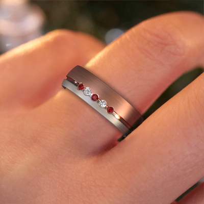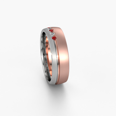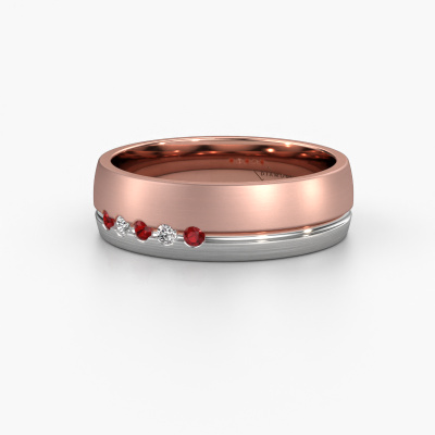 Wat een prachtige combinatie van twee edelmetalen, die elkaar zo mooi versterken in de traditionele vormgeving van deze ring! Onze goudsmid vindt het bijzonder om voor jou een unieke trouwring te vervaardigen, die jij zelf hebt samengesteld. Elke dames trouwring die wij leveren is in ons eigen atelier ambachtelijk met de hand gemaakt. Hierdoor is het mogelijk om al je wensen te verwezenlijken in jouw persoonlijke ring, die bij jouw stijl past. In deze traditionele WH0323L25AM trouwring is ronde robijn geplaatst, hij is ±6 mm breed en heeft een matte afwerking. U kunt deze dames trouwring zelf samenstellen in verschillende edelmetaal combinaties, deze heeft de combinatie 14 Carat rosé goud met witgoud. Met behulp van onze configurator kun je de trouwring in verschillende edelmetalen en kleuren samenstellen. Onze sieradenontwerpers zetten je ontwerp vervolgens om in een 3D ontwerp, zodat je precies kunt zien hoe je sieraad eruit komt te zien. Onze goudsmeden vervaardigen daarna je trouwring met de hand, volgens de oude ambachten. Het is namelijk onze uitdaging om precies die trouwring te vervaardigen die jij in gedachten hebt. Een unieke trouwring die helemaal bij jullie stijl past!Heb je nog meer wensen voor je trouwring en kun je deze hier niet terug vinden? Neem gerust contact op met onze designers! Zo kunnen we een ring juist mat maken, breder of smaller. Ook gravures zijn in de meeste gevallen mogelijk. En heb je een eigen idee voor mooie trouwringen? Onze sieradenontwerpers vinden het een prachtige uitdaging om jouw ring helemaal naar jouw voorstelling te ontwerpen!Door de modernste technieken, gecombineerd met ambachtelijk handwerk, kunnen wij je trouwringen leveren voor een prijs die altijd 30% goedkoper is. Ook doordat we alle trouwringen zelf gaan maken, zodra een bestelling komt, hebben we geen dure voorraden en kunnen we daardoor jou de beste prijsgarantie geven, voor juwelierskwaliteit!Om het voor jou makkelijker te maken kun je ieder besteld sieraad binnen 30 dagen na aflevering eenvoudig weer retour sturen.