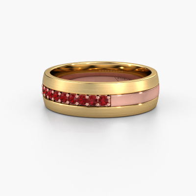Een bijzondere alliance rosé gouden dames trouwring! De combinatie van deze drie edelmetalen symboliseert jullie unieke liefde met elkaar. Prachtig toch! In ons atelier gaat onze goudsmid voor jouw aan het werk. Een bijzondere combinatie van het pure ambacht van het goudsmeden met de modernste technieken zorgt ervoor dat wij al jouw wensen tot in de kleinste details kunnen verwerken in jouw klassiek tricolor trouwring. In deze 3 kleuren WH0413L26APM trouwring is een ronde robijn geplaatst, hij is ±6 mm breed en heeft een glimmende afwerking. Nadat jij jouw ring hebt samengesteld, gaat onze sieradenontwerper hiermee aan de slag. Hij maakt een 3D tekening van jouw trouwring. Deze kunnen we ook gebruiken om een dummy te maken van je ring. Je hebt namelijk de mogelijkheid een dummy te bestellen, zodat je al van tevoren kunt zien hoe jouw ring uiteindelijk wordt. Vervolgens vervaardigt onze vakkundige goudsmid jouw ring in ons atelier. Wij maken gebruik van eerlijk gewonnen goud, zodat jij een ring krijgt waar we zowel op de binnenkant als buitenkant trots op zijn. Overigens kun je ook eigen goud aanleveren. Omdat wij jouw ring met de hand maken, kunnen we je eigen goud hierin gebruiken. Ons doel is om een prachtige glanzende trouwring te creëren, zoals jij deze in gedachte had!Je kunt je trouwens ook laten inspireren door deze trouwring en de ring nog verder naar smaak aanpassen. Wil je bijvoorbeeld liever een bredere of smallere ring of een glimmende of matte ring? Alles is mogelijk. Ook als je zelf een idee hebt voor prachtige trouwringen, of ergens anders een mooie set hebt gezien, die je naar eigen wens zou willen aanpassen: geen probleem! Neem gerust contact op, onze designers bespreken graag de mogelijkheden met je!Trouwringen worden pas vervaardigd als deze besteld worden. Het grote voordeel hiervan is dat wij geen dure voorraden hebben, en dat zie je terug in de prijs. Ook worden alle trouwringen in ons eigen atelier gemaakt door onze eigen goudsmeden, en kunnen we je hierdoor een beste prijsgarantie geven, voor een ring in vertrouwde juwelierskwaliteit.Om het voor jou makkelijker te maken kun je ieder besteld sieraad binnen 30 dagen na aflevering eenvoudig weer retour sturen.