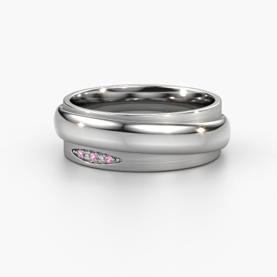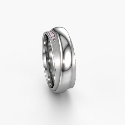Een echte stijlvolle moderne trouwring! Deze prachtige trouwring voor dames is gezet met ronde roze saffier. Doordat onze goudsmeden de platina trouwring met de hand vervaardigen in ons eigen atelier, worden de roze saffier met uiterste precisie geplaatst, waardoor de lichtinval op de roze saffier optimaal is. De breedte van deze moderne WH2038L trouwring is ±7 mm en hij is mat/glimmende afgewerkt. Nadat je je trouwring besteld hebt, gaat onze goudsmid direct met jouw trouwring aan de slag. Wist je dat wij de nieuwste technieken gecombineerd hebben met het oude ambacht? Zo ontwerpen wij eerst jouw sieraad in 3D. Hier kun je, indien gewenst, een dummy van ontvangen, zodat je al kunt kijken of deze helemaal naar jouw wens is. Vervolgens vervaardigt onze perfectionistische goudsmid jouw trouwring in ons atelier, geheel met de hand. Onze passie ligt daarin, dat we iedere keer opnieuw een unieke trouwring kunnen creëren, met de beste afwerking. Zodat jij uiteindelijk die trouwring ontvangt, die helemaal naar jouw wensen vervaardigd is.Laat je gerust inspireren door onze modellen. Je kunt deze trouwring ook nog verder aanpassen: breder of smaller, glimmend of juist mat? Geen probleem! Ook als je zelf ideeën hebt voor bijzondere trouwringen, staan onze sieradenontwerpers graag voor je klaar om je droomring verder uit te werken. Neem gerust met ons contact op!Trouwringen worden pas vervaardigd als deze besteld worden. Het grote voordeel hiervan is dat wij geen dure voorraden hebben, en dat zie je terug in de prijs. Ook worden alle trouwringen in ons eigen atelier gemaakt door onze eigen goudsmeden, en kunnen we je hierdoor een beste prijsgarantie geven, voor een ring in vertrouwde juwelierskwaliteit.Om het voor jou makkelijker te maken kun je ieder besteld sieraad binnen 30 dagen na aflevering eenvoudig weer retour sturen.