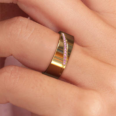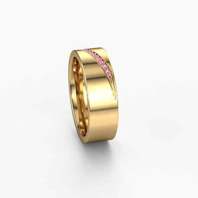 Een echte stijlvolle 14 Carat moderne trouwring! Deze prachtige trouwring voor dames is gezet met ronde roze saffier. Doordat onze goudsmeden de gouden trouwring met de hand vervaardigen in ons eigen atelier, worden de roze saffier met uiterste precisie geplaatst, waardoor de lichtinval op de roze saffier optimaal is. De breedte van deze moderne WH2146L17A trouwring is ±7 mm en hij is glimmende afgewerkt. In ons gespecialiseerde team verwerkt de sieradenontwerper jouw trouwring tot een 3D ontwerp. Wanneer je wilt, kun je hier ook een dummy van bestellen, zodat je de trouwring al van tevoren kunt zien en passen. Onze goudsmid werkt vervolgens in ons atelier met de hand om heel nauwkeurig jouw unieke ring te vervaardigen. Een heel secuur werkje, zowel het vervaardigen als de afwerking vragen een scherp oog. En dat is het mooie van het vak, want uiteindelijk is jouw unieke trouwring het resultaat van een echt ambacht, dat met veel passie uitgevoerd wordt!Heb je nog specifieke wensen? Bijvoorbeeld een glimmende of juiste matte ring (kostenloos)? Breder of smaller? De mogelijkheden voor deze trouwring groot, neem gerust contact met onze designers op om jouw ring nog verder naar jouw voorkeuren aan te passen. Ook als je ideeën hebt voor een ontwerp van je eigen trouwringen of een bepaalde ring in de winkel hebt gezien, kun je deze altijd bespreken met onze sieradenontwerpers. Zij vinden het een mooie uitdaging om precies die ring te ontwerpen die jij in gedachten hebt!Omdat wij zelf alle trouwringen maken en direct aan jou leveren kunnen wij je trouwringen leveren tegen een prijs die je nergens anders zult tegenkomen. Een ring wordt pas gemaakt als we een bestelling krijgen, hierdoor hebben wij geen dure voorraden en kunnen wij jou de beste prijs garanderen.Om het voor jou makkelijker te maken kun je ieder besteld sieraad binnen 30 dagen na aflevering eenvoudig weer retour sturen.