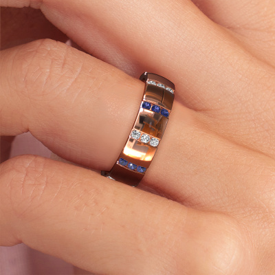 Wanneer je echt op zoek bent naar een rosé gouden exclusieve, design huwelijksring met een prachtige uitstraling, dan is deze huwelijksring een absoluut mooie keuze. Juist doordat deze naar jouw stijl aangepast kan worden, kun je van deze huwelijksring een unieke, exclusieve huwelijksring maken. In deze design huwelijksring voor dames smelten ambachtelijk vakmanschap, liefde en passie samen met de modernste technieken. In deze design Juul huwelijksring is saffier 1.5 mm geplaatst, hij is ±5 mm breed en heeft een glimmende afwerking. Nadat jij jouw ring hebt samengesteld, gaat onze sieradenontwerper hiermee aan de slag. Hij maakt een 3D tekening van jouw huwelijksring. Deze kunnen we ook gebruiken om een dummy te maken van je ring. Je hebt namelijk de mogelijkheid een dummy te bestellen, zodat je al van tevoren kunt zien hoe jouw ring uiteindelijk wordt. Vervolgens vervaardigt onze vakkundige goudsmid jouw ring in ons atelier. Wij maken gebruik van eerlijk gewonnen goud, zodat jij een ring krijgt waar we zowel op de binnenkant als buitenkant trots op zijn. Overigens kun je ook eigen goud aanleveren. Omdat wij jouw ring met de hand maken, kunnen we je eigen goud hierin gebruiken. Ons doel is om een prachtige glanzende huwelijksring te creëren, zoals jij deze in gedachte had!Heb je nog meer wensen voor je huwelijksring? Bijvoorbeeld een smallere of breder ring? Of juist een glimmende of matte ring? Er zijn nog talloze variaties mogelijk. Deze kun je altijd bespreken met onze sieradenontwerpers. Ook als je zelf een bepaald design in je hoofd hebt, helpen onze designers je graag verder om jouw huwelijksringen uit te tekenen totdat deze helemaal naar jouw smaak is samengesteld. Neem gerust contact met ons op!Omdat wij zelf alle huwelijksringen maken en direct aan u leveren kunnen wij u huwelijksringen leveren tegen een prijs die u nergens anders zult tegenkomen. Een ring wordt pas gemaakt als we een bestelling krijgen, hierdoor hebben wij geen dure voorraden en kunnen wij u de beste prijs garanderen.Om het voor jou makkelijker te maken kun je ieder besteld sieraad binnen 30 dagen na aflevering eenvoudig weer retour sturen.