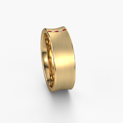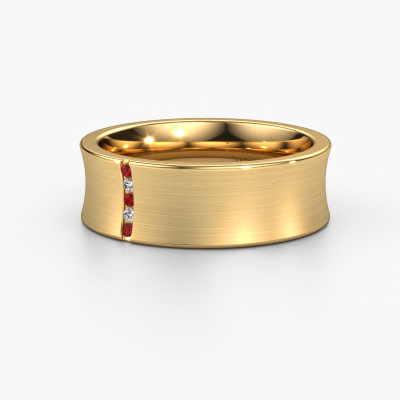 Een bijzondere trouwring! Uniek, net als jullie relatie uniek is! Iedereen is anders en daarom wil je ook geen standaard trouwring. Deze moderne WH2021B dames trouwring is door onze juwelen ontwerpers ontworpen en wordt door onze goudsmid met de hand vervaardigd. Daarbij worden het oude, pure ambacht gecombineerd met de modernste technieken om het mooiste resultaat te creëren. Want onze goudsmid gaat voor perfectie in alle facetten. Een unieke, handgemaakte trouwring, gemaakt om jullie liefde te bezegelen op de grote dag! In deze moderne WH2021B trouwring van goud is robijn geplaatst, hij is ±7 mm breed en heeft een mat/glimmende afwerking. Goud is hét symbool van de liefde, en daarom verwerkt onze goudsmid dit graag in een moderne trouwring voor jou. Wij zijn aangesloten bij de Responsible Jewellery Council. Dit betekent dat wij werken met eerlijk gewonnen goud, iets waar we uiteraard trots op zijn. Het is trouwens ook mogelijk om je eigen goud te laten verwerken in jouw trouwring. Doordat alle sieraden door onze goudsmid met de hand in ons atelier wordt gemaakt, kunnen wij jou deze optie aanbieden. Hierdoor heb jij de gelegenheid om jouw ring nog persoonlijker te maken, een ring met een verhaal!Heb je nog meer wensen voor je trouwring? Bijvoorbeeld een smallere of breder ring? Of juist een glimmende of matte ring? Er zijn nog talloze variaties mogelijk. Deze kun je altijd bespreken met onze sieradenontwerpers. Ook als je zelf een bepaald design in je hoofd hebt, helpen onze designers je graag verder om jouw trouwringen uit te tekenen totdat deze helemaal naar jouw smaak is samengesteld. Neem gerust contact met ons op!Omdat wij zelf alle trouwringen maken en direct aan u leveren kunnen wij u trouwringen leveren tegen een prijs die u nergens anders zult tegenkomen. Een ring wordt pas gemaakt als we een bestelling krijgen, hierdoor hebben wij geen dure voorraden en kunnen wij u de beste prijs garanderen.Om het voor jou makkelijker te maken kun je ieder besteld sieraad binnen 30 dagen na aflevering eenvoudig weer retour sturen.