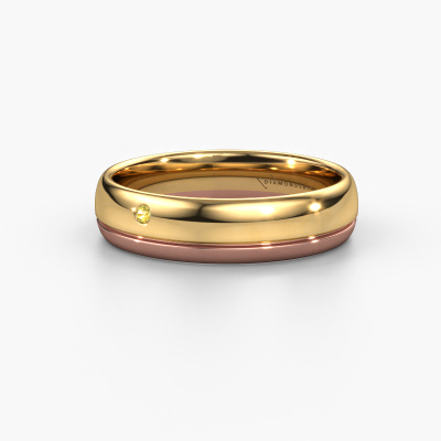 Een unieke bicolor gouden dames trouwring, door jullie zelf ontworpen en ambachtelijk met de hand gemaakt door onze goudsmid in ons eigen atelier! Een prachtig symbool, dat jullie liefde weerspiegelt en je je leven lang mee mag dragen! Elke trouwring die wij leveren is in ons eigen atelier ambachtelijk met de hand gemaakt. Hierdoor is het mogelijk om al je wensen te verwezenlijken in jouw persoonlijke ring, die bij jouw stijl past. In deze traditionele WH0301L35AP trouwring is ronde gele saffier geplaatst, hij is ±5 mm breed en heeft een glimmende afwerking. Je kunt in de configurator hierboven aangeven welke combinatie van edelmetalen bij jou passen, alles is mogelijk! Het is wel goed om te kijken naar de eigenschappen van de edelmetalen. Goud en zilver zijn bijvoorbeeld twee zachtere edelmetalen. Hoe puurder deze door onze goudsmid worden samengesteld, hoe hoger het aantal karaat, hoe zachter de trouwring is. Maar uiteraard hard genoeg voor het verwerken in een traditionele trouwring! Wanneer je een edelmetaal zou willen, die je leven lang mee zal gaan, dan raden wij platina aan. Dit is het sterkste en meest duurzame edelmetaal waar onze goudsmid mee werkt.Heb je nog meer wensen voor je trouwring? Bijvoorbeeld een smallere of breder ring? Of juist een glimmende of matte ring? Er zijn nog talloze variaties mogelijk. Deze kun je altijd bespreken met onze sieradenontwerpers. Ook als je zelf een bepaald design in je hoofd hebt, helpen onze designers je graag verder om jouw trouwringen uit te tekenen totdat deze helemaal naar jouw smaak is samengesteld. Neem gerust contact met ons op!Doordat wij alle trouwringen pas vervaardigen, zodra een bestelling geplaatst wordt, hebben wij geen dure voorraden. Ook worden alle sieraden in eigen atelier naar ambachtelijk vakmanschap gemaakt. Hierdoor kunnen we jou een beste prijsgarantie leveren, de prijs ligt 30% lager dan bij andere juweliers. En dat terwijl jouw trouwringen geleverd worden in de vertrouwde juwelierskwaliteit!Om het voor jou makkelijker te maken kun je ieder besteld sieraad binnen 30 dagen na aflevering eenvoudig weer retour sturen.