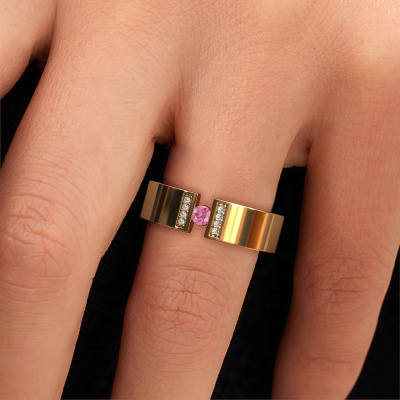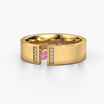 Een unieke trouwring met roze saffier! Het bijzondere van deze dames WH2096L16C trouwring van goud is dat je de een speciale tekst kunt laten graveren, een tekst die een speciale betekenis voor jou heeft. Een woord, een korte zin, een deel van een songtekst, welke tekst is voor jou heel speciaal? Laat deze vereeuwigen door middel van een prachtige gravure op deze moderne trouwring. De breedte van deze eigen tekst trouwring voor dames is ±6 mm breed. Met behulp van onze configurator kun je de trouwring in verschillende edelmetalen en kleuren samenstellen. Onze sieradenontwerpers zetten je ontwerp vervolgens om in een 3D ontwerp, zodat je precies kunt zien hoe je sieraad eruit komt te zien. Onze goudsmeden vervaardigen daarna je trouwring met de hand, volgens de oude ambachten. Het is namelijk onze uitdaging om precies die trouwring te vervaardigen die jij in gedachten hebt. Een unieke trouwring die helemaal bij jullie stijl past!Deze trouwring kan ook als inspiratiebron dienen. Wil jij de ring mat of glimmend (kosteloos), of zou je hem breder of smaller willen? Alles is mogelijk. Omdat er talloze variaties mogelijk zijn kunnen wij niet alles tonen op onze website. Heb je zelf een idee voor mooie trouwringen of heb je ergens anders een mooie trouwringen set gezien? Neem dan eens contact met ons op, onze designers staan voor je klaar om je hierbij te helpen.Doordat wij alle trouwringen pas vervaardigen, zodra een bestelling geplaatst wordt, hebben wij geen dure voorraden. Ook worden alle sieraden in eigen atelier naar ambachtelijk vakmanschap gemaakt. Hierdoor kunnen we jou een beste prijsgarantie leveren, de prijs ligt 30% lager dan bij andere juweliers. En dat terwijl jouw trouwringen geleverd worden in de vertrouwde juwelierskwaliteit!Om het voor jou makkelijker te maken kun je ieder besteld sieraad binnen 30 dagen na aflevering eenvoudig weer retour sturen.