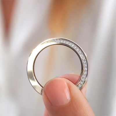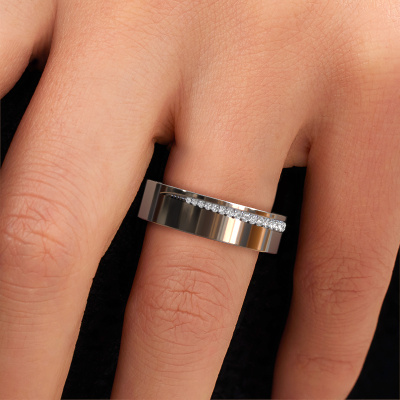 In deze design trouwring voor dames smelten ambachtelijk vakmanschap, liefde en passie samen met de modernste technieken. Het vraagt een geoefend oog, geduld en een vaardige hand om deze platina trouwring tot in de kleinste details perfect samen te stellen. Maar daar gaan onze goudsmeden dan ook absoluut voor! Op deze manier creëer je een exclusieve ring, tot in de details aangepast naar jullie wensen. En handgemaakt in ons eigen atelier. In deze design WH1002L15DP trouwring is lab-grown diamant 0.374 crt geplaatst, hij is ±6 mm breed en heeft een glimmende afwerking. Je kunt in de configurator hierboven aangeven welke combinatie van edelmetalen bij jou passen, alles is mogelijk! Het is wel goed om te kijken naar de eigenschappen van de edelmetalen. Goud en zilver zijn bijvoorbeeld twee zachtere edelmetalen. Hoe puurder deze door onze goudsmid worden samengesteld, hoe hoger het aantal karaat, hoe zachter de trouwring is. Maar uiteraard hard genoeg voor het verwerken in een design trouwring! Wanneer je een edelmetaal zou willen, die je leven lang mee zal gaan, dan raden wij platina aan. Dit is het sterkste en meest duurzame edelmetaal waar onze goudsmid mee werkt.Heb je nog meer wensen voor je trouwring? Bijvoorbeeld een smallere of breder ring? Of juist een glimmende of matte ring? Er zijn nog talloze variaties mogelijk. Deze kun je altijd bespreken met onze sieradenontwerpers. Ook als je zelf een bepaald design in je hoofd hebt, helpen onze designers je graag verder om jouw trouwringen uit te tekenen totdat deze helemaal naar jouw smaak is samengesteld. Neem gerust contact met ons op!Trouwringen worden pas vervaardigd als deze besteld worden. Het grote voordeel hiervan is dat wij geen dure voorraden hebben, en dat zie je terug in de prijs. Ook worden alle trouwringen in ons eigen atelier gemaakt door onze eigen goudsmeden, en kunnen we je hierdoor een beste prijsgarantie geven, voor een ring in vertrouwde juwelierskwaliteit.Om het voor jou makkelijker te maken kun je ieder besteld sieraad binnen 30 dagen na aflevering eenvoudig weer retour sturen.