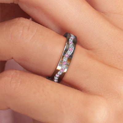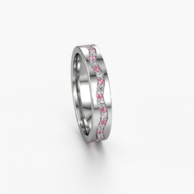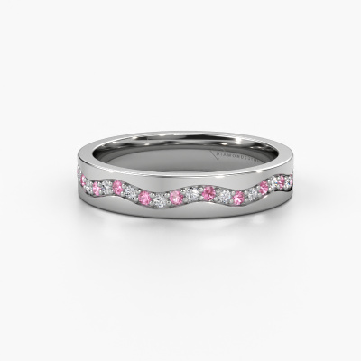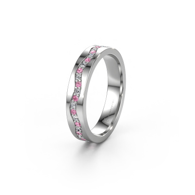 Wist je dat de Eternity trouwring ook niet alleen van uitstraling, maar ook symbolisch een prachtige trouwring is? De Eternity trouwring, met de naast elkaar geplaatste diamantjes, staat voor jullie eeuwigdurende liefde. Doordat de steentjes geheel rondom zijn geplaatst, is er geen begin en geen eind. Prachtig toch? De breedte van deze golfslag platina WH0803L14AP dames trouwring is ±4 mm breed en hij is gezet met roze saffier 1.3 mm. In ons gespecialiseerde team verwerkt de sieradenontwerper jouw trouwring tot een 3D ontwerp. Wanneer je wilt, kun je hier ook een dummy van bestellen, zodat je de trouwring al van tevoren kunt zien en passen. Onze goudsmid werkt vervolgens in ons atelier met de hand om heel nauwkeurig jouw unieke ring te vervaardigen. Een heel secuur werkje, zowel het vervaardigen als de afwerking vragen een scherp oog. En dat is het mooie van het vak, want uiteindelijk is jouw unieke trouwring het resultaat van een echt ambacht, dat met veel passie uitgevoerd wordt!Deze trouwring kan ook als inspiratiebron dienen. Wil jij de ring mat of glimmend (kosteloos), of zou je hem breder of smaller willen? Alles is mogelijk. Omdat er talloze variaties mogelijk zijn kunnen wij niet alles tonen op onze website. Heb je zelf een idee voor mooie trouwringen of heb je ergens anders een mooie trouwringen set gezien? Neem dan eens contact met ons op, onze designers staan voor je klaar om je hierbij te helpen.Omdat wij zelf alle trouwringen maken en direct aan u leveren kunnen wij u trouwringen leveren tegen een prijs die u nergens anders zult tegenkomen. Een ring wordt pas gemaakt als we een bestelling krijgen, hierdoor hebben wij geen dure voorraden en kunnen wij u de beste prijs garanderen.Om het voor jou makkelijker te maken kun je ieder besteld sieraad binnen 30 dagen na aflevering eenvoudig weer retour sturen.