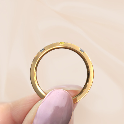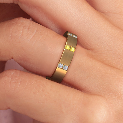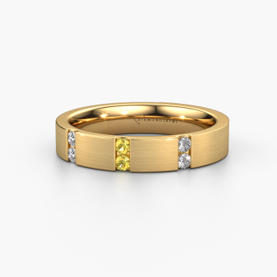 Deze moderne dames trouwring is een prachtige, moderne trouwring, die jullie unieke liefde voor elkaar symboliseert! Perfect passend bij de man met een hedendaagse stijl. En deze kunnen jullie helemaal samenstellen naar jullie eigen wensen en ideeën. Onze goudsmid ziet in iedere trouwring een mooie uitdaging en gaat met jullie ontwerp in ons atelier graag aan de slag. Met veel zorg en passie vervaardigt hij jullie trouwring WH2133L14BM met de hand en maakt daarbij gebruik van zowel de meest innovatieve technieken als het pure vakmanschap. Met deze unieke, moderne trouwring als resultaat! In deze moderne WH2133L14BM trouwring is ronde gele saffier geplaatst, hij is ±4 mm breed en heeft een mat/glimmende afwerking. Je kunt in de configurator hierboven aangeven welke combinatie van edelmetalen bij jou passen, alles is mogelijk! Het is wel goed om te kijken naar de eigenschappen van de edelmetalen. Goud en zilver zijn bijvoorbeeld twee zachtere edelmetalen. Hoe puurder deze door onze goudsmid worden samengesteld, hoe hoger het aantal karaat, hoe zachter de trouwring is. Maar uiteraard hard genoeg voor het verwerken in een moderne trouwring! Wanneer je een edelmetaal zou willen, die je leven lang mee zal gaan, dan raden wij platina aan. Dit is het sterkste en meest duurzame edelmetaal waar onze goudsmid mee werkt.Heb je nog meer wensen voor je trouwring en kun je deze hier niet terug vinden? Neem gerust contact op met onze designers! Zo kunnen we een ring juist mat maken, breder of smaller. Ook gravures zijn in de meeste gevallen mogelijk. En heb je een eigen idee voor mooie trouwringen? Onze sieradenontwerpers vinden het een prachtige uitdaging om jouw ring helemaal naar jouw voorstelling te ontwerpen!Omdat wij zelf alle trouwringen maken en direct aan jou leveren kunnen wij je trouwringen leveren tegen een prijs die je nergens anders zult tegenkomen. Een ring wordt pas gemaakt als we een bestelling krijgen, hierdoor hebben wij geen dure voorraden en kunnen wij jou de beste prijs garanderen.Om het voor jou makkelijker te maken kun je ieder besteld sieraad binnen 30 dagen na aflevering eenvoudig weer retour sturen.