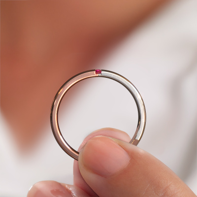 Een unieke bicolor rosé gouden dames trouwring, door jullie zelf ontworpen en ambachtelijk met de hand gemaakt door onze goudsmid in ons eigen atelier! Een prachtig symbool, dat jullie liefde weerspiegelt en je je leven lang mee mag dragen! Elke trouwring die wij leveren is in ons eigen atelier ambachtelijk met de hand gemaakt. Hierdoor is het mogelijk om al je wensen te verwezenlijken in jouw persoonlijke ring, die bij jouw stijl past. In deze moderne WH1103L25AP trouwring is ronde robijn geplaatst, hij is ±5 mm breed en heeft een glimmende afwerking.
