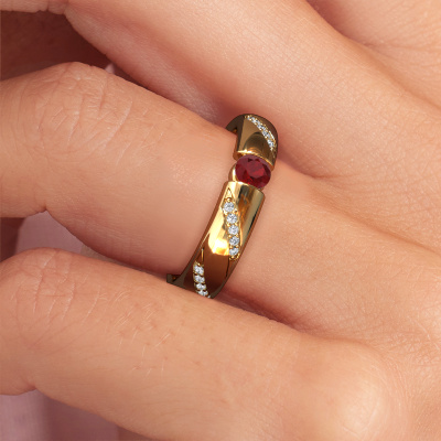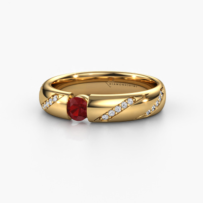 In deze exclusieve trouwring voor dames smelten ambachtelijk vakmanschap, liefde en passie samen met de modernste technieken. Het vraagt een geoefend oog, geduld en een vaardige hand om deze gouden trouwring tot in de kleinste details perfect samen te stellen. Maar daar gaan onze goudsmeden dan ook absoluut voor! Op deze manier creëer je een exclusieve ring, tot in de details aangepast naar jullie wensen. En handgemaakt in ons eigen atelier. In deze exclusieve WH2102L34A trouwring is robijn 4 mm geplaatst, hij is ±5 mm breed en heeft een glimmende afwerking.