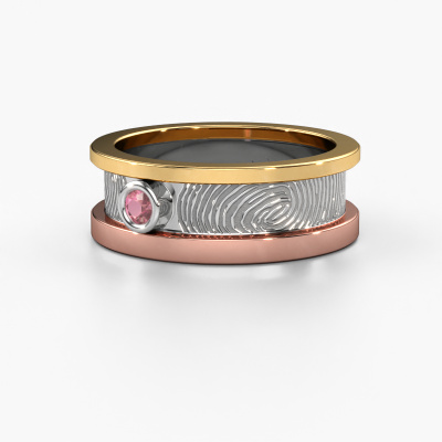Wat is er unieker dan een vingerafdruk? Daarom is deze rosé gouden dames trouwring met tourmalijn pink ook zo bijzonder. De eigen afdruk van je geliefde, gegraveerd in het symbool van jullie eeuwige liefde voor elkaar. Hoe mooi is dat om deze fantasie trouwring om de vinger van je partner te schuiven op jullie huwelijksdag? Hoe het werkt? Je besteld eerst de trouwring zoals je hem wilt hebben. Nadat je hem besteld hebt, stuur je ons een email met de vingerafdruk. Hoe je die maakt, kun je lezen onderaan deze pagina in onze kennisbank. De breedte van deze Francisca trouwring is ±7 mm. Nadat je je trouwring besteld hebt, gaat onze goudsmid direct met jouw trouwring aan de slag. Wist je dat wij de nieuwste technieken gecombineerd hebben met het oude ambacht? Zo ontwerpen wij eerst jouw sieraad in 3D. Hier kun je, indien gewenst, een dummy van ontvangen, zodat je al kunt kijken of deze helemaal naar jouw wens is. Vervolgens vervaardigt onze perfectionistische goudsmid jouw trouwring in ons atelier, geheel met de hand. Onze passie ligt daarin, dat we iedere keer opnieuw een unieke trouwring kunnen creëren, met de beste afwerking. Zodat jij uiteindelijk die trouwring ontvangt, die helemaal naar jouw wensen vervaardigd is.Je kunt je trouwens ook laten inspireren door deze trouwring en de ring nog verder naar smaak aanpassen. Wil je bijvoorbeeld liever een bredere of smallere ring of een glimmende of matte ring? Alles is mogelijk. Ook als je zelf een idee hebt voor prachtige trouwringen, of ergens anders een mooie set hebt gezien, die je naar eigen wens zou willen aanpassen: geen probleem! Neem gerust contact op, onze designers bespreken graag de mogelijkheden met je!Doordat wij alle trouwringen pas vervaardigen, zodra een bestelling geplaatst wordt, hebben wij geen dure voorraden. Ook worden alle sieraden in eigen atelier naar ambachtelijk vakmanschap gemaakt. Hierdoor kunnen we jou een beste prijsgarantie leveren, de prijs ligt 30% lager dan bij andere juweliers. En dat terwijl jouw trouwringen geleverd worden in de vertrouwde juwelierskwaliteit!Om het voor jou makkelijker te maken kun je ieder besteld sieraad binnen 30 dagen na aflevering eenvoudig weer retour sturen.