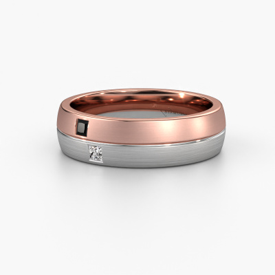 Een unieke bicolor rosé gouden dames trouwring, door jullie zelf ontworpen en ambachtelijk met de hand gemaakt door onze goudsmid in ons eigen atelier! Een prachtig symbool, dat jullie liefde weerspiegelt en je je leven lang mee mag dragen! Elke trouwring die wij leveren is in ons eigen atelier ambachtelijk met de hand gemaakt. Hierdoor is het mogelijk om al je wensen te verwezenlijken in jouw persoonlijke ring, die bij jouw stijl past. In deze moderne WH0250L26BM trouwring is princess zwarte diamant geplaatst, hij is ±6 mm breed en heeft een matte afwerking. Nadat jij jouw ring hebt samengesteld, gaat onze sieradenontwerper hiermee aan de slag. Hij maakt een 3D tekening van jouw trouwring. Deze kunnen we ook gebruiken om een dummy te maken van je ring. Je hebt namelijk de mogelijkheid een dummy te bestellen, zodat je al van tevoren kunt zien hoe jouw ring uiteindelijk wordt. Vervolgens vervaardigt onze vakkundige goudsmid jouw ring in ons atelier. Wij maken gebruik van eerlijk gewonnen goud, zodat jij een ring krijgt waar we zowel op de binnenkant als buitenkant trots op zijn. Overigens kun je ook eigen goud aanleveren. Omdat wij jouw ring met de hand maken, kunnen we je eigen goud hierin gebruiken. Ons doel is om een prachtige glanzende trouwring te creëren, zoals jij deze in gedachte had!Je kunt je trouwens ook laten inspireren door deze trouwring en de ring nog verder naar smaak aanpassen. Wil je bijvoorbeeld liever een bredere of smallere ring of een glimmende of matte ring? Alles is mogelijk. Ook als je zelf een idee hebt voor prachtige trouwringen, of ergens anders een mooie set hebt gezien, die je naar eigen wens zou willen aanpassen: geen probleem! Neem gerust contact op, onze designers bespreken graag de mogelijkheden met je!Omdat wij zelf alle trouwringen maken en direct aan jou leveren kunnen wij je trouwringen leveren tegen een prijs die je nergens anders zult tegenkomen. Een ring wordt pas gemaakt als we een bestelling krijgen, hierdoor hebben wij geen dure voorraden en kunnen wij jou de beste prijs garanderen.Om het voor jou makkelijker te maken kun je ieder besteld sieraad binnen 30 dagen na aflevering eenvoudig weer retour sturen.