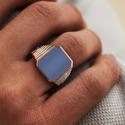 Iedereen kent het design van dit bekende horlogemerk. Met zijn schakels in twee kleuren rosé goud, past deze zware 14 Carat rosé gouden Brent 3 zegelring bij de exclusieve, succesvolle man. Een man die een statement wil maken met een opvallende zegelring met 14x12 mm blauw lagensteen. Laat zien wie je bent!Wat is er nu mooier, een exclusieve zegelring ontworpen door jou zelf, met de hand gemaakt door ons. Je kunt zelf ieder model aanpassen met de verschillende edelmetalen en edelstenen. Zo creëer je een unieke zegelring. Deze zegelring kun je op vele manieren zelf samenstellen. Uiteraard kun je altijd contact met ons opnemen. Wij helpen je graag bij het samenstellen van jouw exclusieve zegelring. Vind je het ontwerp mooi maar je zou toch graag iets aan willen passen, of een edelsteen in het sieraad willen hebben die niet in deze lijst staat, neem dan contact met ons op en wij vertellen je graag over alle mogelijkheden.