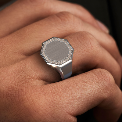 Met deze vlakke Floris Octa 3 heren ring presenteer je jezelf, want de juiste ring is een krachtig persoonlijk statement. Hier is de Floris Octa 3 stoer heren ring afgebeeld in platina. Is dit niet geheel jouw kleur, dan kun je dit aanpassen naar het edelmetaal van je keuze. Tenslotte wil je een heren ring in jouw stijl. Een ring die bij jou hoort. En waarmee je zegt: dit ben ik. Onze goudsmeden vervaardigen met veel passie en zorgvuldigheid jouw zegelring op maat en naar eigen wens. De platina zegelring zoals hier is afgebeeld, kan naar jouw wens worden aangepast met de configurator. Heb je bepaalde ideeën die je met de configurator niet kunt toepassen, dan kun je dit altijd even opnemen met onze sieradenontwerpers. Met vragen kun je uiteraard ook altijd terecht.Onze talentvolle ontwerpers voegen elke dag nieuwe designs toe aan de website, en werken samen om tot een zo gevarieerd mogelijke collectie te komen met de mooiste sieraden. Wil je een ring laten maken naar eigen ontwerp, neem dan eens contact met ons op voor een offerte. Graag doen wij je een aanbod, waarvan wij denken dat je wat betreft kwaliteit en prijs versteld zult staan.Door onze modernste technieken kunnen wij met uiterste precisie prachtige sieraden te ontwerpen en voor jou personaliseren in de hoogste juwelierskwaliteit. Tegelijkertijd zijn onze ringen altijd 30% goedkoper dan bij een andere juwelier. Dit komt doordat alle ringen pas vervaardigd worden op het moment dat deze besteld wordt en we daardoor geen dure voorraden hoeven te hanteren. Mocht je aan een bepaald budget gebonden zijn, kunnen we je graag adviseren welke combinatie je het beste kunt kiezen.Om het voor jou makkelijker te maken kun je ieder besteld sieraad binnen 30 dagen na aflevering eenvoudig weer retour sturen.