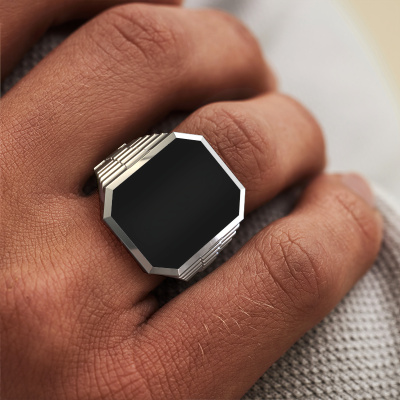 Iedereen kent het design van dit bekende horlogemerk. Met zijn schakels in twee kleuren platina, past deze zware platina Brent 5 zegelring bij de moderne, succesvolle man. Een man die een statement wil maken met een opvallende zegelring met 18x15 mm onyx. Laat zien wie je bent!De stoere Brent 5 zegelring zoals je hier afgebeeld ziet, kan helemaal naar jouw wensen verpersoonlijkt worden. De mogelijkheden met onze configurator zijn zeer uitgebreid, maar mocht je toch iets aan jouw persoonlijke Brent 5 zegelring willen aanpassen wat niet als optie geboden wordt, dan kun je altijd contact met ons opnemen.Elke dag worden nieuwe ring ontwerpen toegevoegd aan de site door ons team van talentvolle en gepassioneerde ontwerpers. Hierbij wordt ernaar gestreefd om een zo gevarieerd mogelijke collectie aan te bieden. Heb je bepaalde ideeën voor een ring, neem dan eens contact op voor een offerte. Wij doen je een aanbod wat betreft prijs en kwaliteit waar je geen nee tegen zult kunnen zeggen.Door onze modernste technieken kunnen wij met uiterste precisie prachtige sieraden te ontwerpen en voor jou personaliseren in de hoogste juwelierskwaliteit. Tegelijkertijd zijn onze ringen altijd 30% goedkoper dan bij een andere juwelier. Dit komt doordat alle ringen pas vervaardigd worden op het moment dat deze besteld wordt en we daardoor geen dure voorraden hoeven te hanteren. Mocht je aan een bepaald budget gebonden zijn, kunnen we je graag adviseren welke combinatie je het beste kunt kiezen.Om het voor jou makkelijker te maken kun je ieder besteld sieraad binnen 30 dagen na aflevering eenvoudig weer retour sturen.