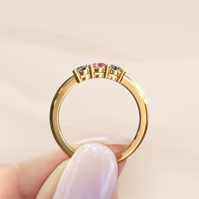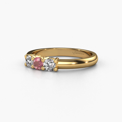 Deze 3 steens ring heeft de naam Michelle 3. Dit type ring wordt een 'alliance' ring genoemd, omdat hij recht is uitgevoerd. Hierdoor kan de ring samen met andere ringen gedragen worden. Deze ring is uitgevoerd in 14 Carat goud en heeft tourmalijn pink in combinatie met lab-grown diamant ter grootte van 3.7 mm in de band. Zoals je ziet, worden er bij deze prachtige gouden alliance ring tourmalijn pink naast elkaar op de ring gezet. De betekenis van alliance is letterlijk 'samenwerken'. En dat is precies wat deze edelstenen doen: samen creëren ze op de band een extra bijzonder effect bij een klassieke ring! Een prachtige symboliek voor een ring, toch? Alle zorgvuldig geselecteerde tourmalijn pink worden met de hand geplaatst door onze meester goudsmid. Een zeer precies werkje, dat alleen door onze unieke combinatie van puur vakmanschap en de modernste technieken het optimale effect krijgt. Alle edelstenen moeten namelijk precies op dezelfde manier geplaatst worden om het licht perfect te verspreiden. Daarom zal de goudsmid deze ring steeds weer tegen het licht houden om te zien of de tourmalijn pink juist geplaatst zijn. Het vraagt een vaardige hand en veel geduld, maar het resultaat is een echt meesterstuk. En daar gaan we voor!Ben je gebonden aan een bepaald budget? Neem gerust contact met ons op, we adviseren graag over alle mogelijkheden. Sowieso leveren wij alle ringen tegen een prijs die je nergens anders tegen komt, doordat we de ring pas vervaardigen wanneer je deze besteld. Hierdoor kunnen wij je een beste prijs garantie geven.