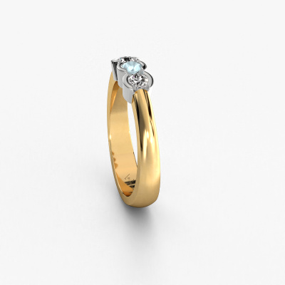 Deze 3 steens ring heeft de naam Lotte 3. Dit type ring wordt een 'alliance' ring genoemd, omdat hij recht is uitgevoerd. Hierdoor kan de ring samen met andere ringen gedragen worden. Deze ring is uitgevoerd in 14 Carat goud en heeft aquamarijn in combinatie met diamant ter grootte van 3 mm in de band. Zoals je ziet, worden er bij deze prachtige gouden alliance ring aquamarijn naast elkaar op de ring gezet. De betekenis van alliance is letterlijk 'samenwerken'. En dat is precies wat deze edelstenen doen: samen creëren ze op de band een extra bijzonder effect bij een moderne ring! Een prachtige symboliek voor een ring, toch? Alle zorgvuldig geselecteerde aquamarijn worden met de hand geplaatst door onze meester goudsmid. Een zeer precies werkje, dat alleen door onze unieke combinatie van puur vakmanschap en de modernste technieken het optimale effect krijgt. Alle edelstenen moeten namelijk precies op dezelfde manier geplaatst worden om het licht perfect te verspreiden. Daarom zal de goudsmid deze ring steeds weer tegen het licht houden om te zien of de aquamarijn juist geplaatst zijn. Het vraagt een vaardige hand en veel geduld, maar het resultaat is een echt meesterstuk. En daar gaan we voor!Door het gebruik van de modernste technieken, gecombineerd met ambachtelijk vakmanschap kunnen wij alle ringen zelf in ons atelier maken. Iedere ring wordt pas gemaakt nadat deze besteld is. Dit heeft als bijkomend voordeel dat we kunnen leveren tegen een prijs die je nergens anders tegenkomt.Elke dag worden nieuwe ring ontwerpen toegevoegd aan de site door ons team van talentvolle en gepassioneerde ontwerpers. Hierbij wordt ernaar gestreefd om een zo gevarieerd mogelijke collectie aan te bieden. Heb je bepaalde ideeën voor een ring, neem dan eens contact op voor een offerte. Wij doen je een aanbod wat betreft prijs en kwaliteit waar je geen nee tegen zult kunnen zeggen.Om het voor jou makkelijker te maken kun je ieder besteld sieraad binnen 30 dagen na aflevering eenvoudig weer retour sturen.'