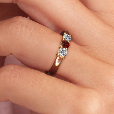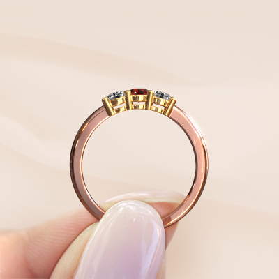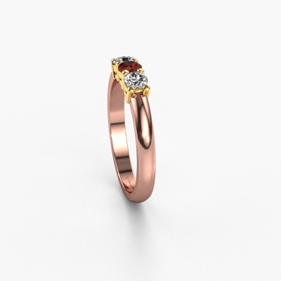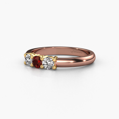 Deze 3 steens ring heeft de naam Michelle 3. Dit type ring wordt een 'alliance' ring genoemd, omdat hij recht is uitgevoerd. Hierdoor kan de ring samen met andere ringen gedragen worden. Deze ring is uitgevoerd in 14 Carat rosé goud en heeft granaat in combinatie met lab-grown diamant ter grootte van 3.7 mm in de band. Zoals je ziet, worden er bij deze prachtige rosé gouden alliance ring granaat naast elkaar op de ring gezet. De betekenis van alliance is letterlijk 'samenwerken'. En dat is precies wat deze edelstenen doen: samen creëren ze op de band een extra bijzonder effect bij een klassieke ring! Een prachtige symboliek voor een ring, toch? Alle zorgvuldig geselecteerde granaat worden met de hand geplaatst door onze meester goudsmid. Een zeer precies werkje, dat alleen door onze unieke combinatie van puur vakmanschap en de modernste technieken het optimale effect krijgt. Alle edelstenen moeten namelijk precies op dezelfde manier geplaatst worden om het licht perfect te verspreiden. Daarom zal de goudsmid deze ring steeds weer tegen het licht houden om te zien of de granaat juist geplaatst zijn. Het vraagt een vaardige hand en veel geduld, maar het resultaat is een echt meesterstuk. En daar gaan we voor!Ben je gebonden aan een bepaald budget? Neem gerust contact met ons op, we adviseren graag over alle mogelijkheden. Sowieso leveren wij alle ringen tegen een prijs die je nergens anders tegen komt, doordat we de ring pas vervaardigen wanneer je deze besteld. Hierdoor kunnen wij je een beste prijs garantie geven.