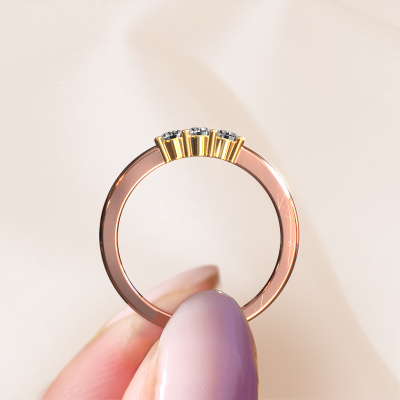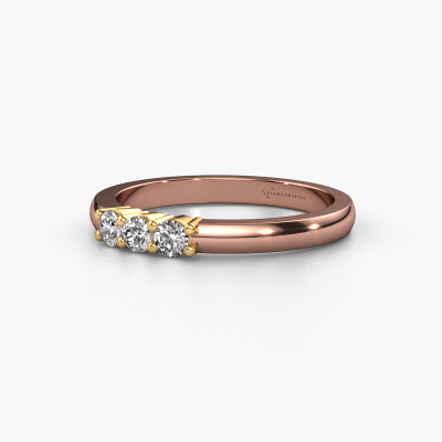 Deze 3 steens ring heeft de naam Yasmin 3. Dit type ring wordt een 'alliance' ring genoemd, omdat hij recht is uitgevoerd. Hierdoor kan de ring samen met andere ringen gedragen worden. Deze ring is uitgevoerd in 14 Carat rosé goud en heeft zirkonia in combinatie met lab-grown diamant ter grootte van 3 mm in de band. Zoals je ziet, worden er bij deze prachtige rosé gouden alliance ring zirkonia's naast elkaar op de ring gezet. De betekenis van alliance is letterlijk 'samenwerken'. En dat is precies wat deze edelstenen doen: samen creëren ze op de band een extra bijzonder effect bij een klassieke ring! Een prachtige symboliek voor een ring, toch? Alle zorgvuldig geselecteerde zirkonia's worden met de hand geplaatst door onze meester goudsmid. Een zeer precies werkje, dat alleen door onze unieke combinatie van puur vakmanschap en de modernste technieken het optimale effect krijgt. Alle edelstenen moeten namelijk precies op dezelfde manier geplaatst worden om het licht perfect te verspreiden. Daarom zal de goudsmid deze ring steeds weer tegen het licht houden om te zien of de zirkonia's juist geplaatst zijn. Het vraagt een vaardige hand en veel geduld, maar het resultaat is een echt meesterstuk. En daar gaan we voor!Door het gebruik van de modernste technieken, gecombineerd met ambachtelijk vakmanschap kunnen wij alle ringen zelf in ons atelier maken. Iedere ring wordt pas gemaakt nadat deze besteld is. Dit heeft als bijkomend voordeel dat we kunnen leveren tegen een prijs die je nergens anders tegenkomt.Onze talentvolle ontwerpers voegen elke dag nieuwe designs toe aan de website, en werken samen om tot een zo gevarieerd mogelijke collectie te komen met de mooiste sieraden. Wil je een ring laten maken naar eigen ontwerp, neem dan eens contact met ons op voor een offerte. Graag doen wij je een aanbod, waarvan wij denken dat je wat betreft kwaliteit en prijs versteld zult staan.Om het voor jou makkelijker te maken kun je ieder besteld sieraad binnen 30 dagen na aflevering eenvoudig weer retour sturen.'