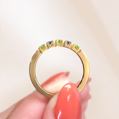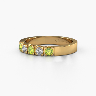 Deze 5 steens ring heeft de naam Dana 5. Dit type ring wordt een 'alliance' ring genoemd, omdat hij recht is uitgevoerd. Hierdoor kan de ring samen met andere ringen gedragen worden. Deze ring is uitgevoerd in 14 Carat goud en heeft peridoot in combinatie met diamant ter grootte van 3 mm in de band. Zoals je ziet, worden er bij deze prachtige gouden alliance ring peridoot naast elkaar op de ring gezet. De betekenis van alliance is letterlijk 'samenwerken'. En dat is precies wat deze edelstenen doen: samen creëren ze op de band een extra bijzonder effect bij een moderne ring! Een prachtige symboliek voor een ring, toch? Alle zorgvuldig geselecteerde peridoot worden met de hand geplaatst door onze meester goudsmid. Een zeer precies werkje, dat alleen door onze unieke combinatie van puur vakmanschap en de modernste technieken het optimale effect krijgt. Alle edelstenen moeten namelijk precies op dezelfde manier geplaatst worden om het licht perfect te verspreiden. Daarom zal de goudsmid deze ring steeds weer tegen het licht houden om te zien of de peridoot juist geplaatst zijn. Het vraagt een vaardige hand en veel geduld, maar het resultaat is een echt meesterstuk. En daar gaan we voor!Omdat wij zelf alle sieraden maken en direct aan jou leveren, kunnen wij je een ring leveren tegen een prijs die je nergens anders zult tegenkomen. Een ring wordt pas gemaakt als we een bestelling krijgen, hierdoor hebben wij geen dure voorraden en kunnen wij jou de beste prijs garanderen. Wij begrijpen dat het kopen van een sieraad online spannend is, en denken graag met je mee over de mogelijkheden binnen jouw budget.Iedere dag worden nieuwe sieraad ontwerpen toegevoegd aan de website. Ons team van gepassioneerde designers streeft ernaar om tot de mooiste ontwerpen te komen, en een zo gevarieerd mogelijk aanbod. Heb je ergens een ring gezien welke je wilt laten maken, stuur ons dan bericht. Wij sturen je graag een offerte toe. Hierin bieden wij de beste prijs en kwaliteit. Je zult dit zeker niet kunnen afslaan!Om het voor jou makkelijker te maken kun je ieder besteld sieraad binnen 30 dagen na aflevering eenvoudig weer retour sturen.'