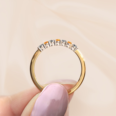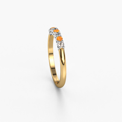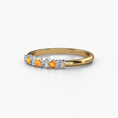Deze 7 steens ring heeft de naam Michelle 7. Dit type ring wordt een 'alliance' ring genoemd, omdat hij recht is uitgevoerd. Hierdoor kan de ring samen met andere ringen gedragen worden. Deze ring is uitgevoerd in 14 Carat goud en heeft citrien in combinatie met diamant ter grootte van 2 mm in de band. Zoals je ziet, worden er bij deze prachtige gouden alliance ring citrien naast elkaar op de ring gezet. De betekenis van alliance is letterlijk 'samenwerken'. En dat is precies wat deze edelstenen doen: samen creëren ze op de band een extra bijzonder effect bij een klassieke ring! Een prachtige symboliek voor een ring, toch? Alle zorgvuldig geselecteerde citrien worden met de hand geplaatst door onze meester goudsmid. Een zeer precies werkje, dat alleen door onze unieke combinatie van puur vakmanschap en de modernste technieken het optimale effect krijgt. Alle edelstenen moeten namelijk precies op dezelfde manier geplaatst worden om het licht perfect te verspreiden. Daarom zal de goudsmid deze ring steeds weer tegen het licht houden om te zien of de citrien juist geplaatst zijn. Het vraagt een vaardige hand en veel geduld, maar het resultaat is een echt meesterstuk. En daar gaan we voor!Met veel passie gaan onze edelsmeden met jouw ring aan de slag in ons atelier, zodra je deze besteld hebt. Doordat we geen sieraden op voorraad hebben, hoeven we de voorraad niet door te berekenen in de prijs. En dat zie je terug in de prijs! We geven je graag een beste prijsgarantie.