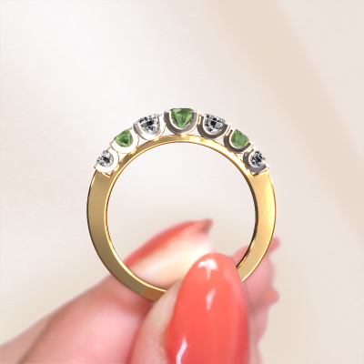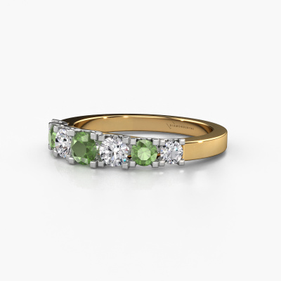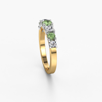 Deze 7 steens ring heeft de naam Selina 3. Dit type ring wordt een 'alliance' ring genoemd, omdat hij recht is uitgevoerd. Hierdoor kan de ring samen met andere ringen gedragen worden. Deze ring is uitgevoerd in 14 Carat goud en heeft toermalijn groen in combinatie met diamant ter grootte van 3.7 mm in de band. Zoals je ziet, worden er bij deze prachtige gouden alliance ring toermalijn groen naast elkaar op de ring gezet. De betekenis van alliance is letterlijk 'samenwerken'. En dat is precies wat deze edelstenen doen: samen creëren ze op de band een extra bijzonder effect bij een moderne ring! Een prachtige symboliek voor een ring, toch? Alle zorgvuldig geselecteerde toermalijn groen worden met de hand geplaatst door onze meester goudsmid. Een zeer precies werkje, dat alleen door onze unieke combinatie van puur vakmanschap en de modernste technieken het optimale effect krijgt. Alle edelstenen moeten namelijk precies op dezelfde manier geplaatst worden om het licht perfect te verspreiden. Daarom zal de goudsmid deze ring steeds weer tegen het licht houden om te zien of de toermalijn groen juist geplaatst zijn. Het vraagt een vaardige hand en veel geduld, maar het resultaat is een echt meesterstuk. En daar gaan we voor!Omdat wij zelf alle sieraden maken en direct aan jou leveren, kunnen wij je een ring leveren tegen een prijs die je nergens anders zult tegenkomen. Een ring wordt pas gemaakt als we een bestelling krijgen, hierdoor hebben wij geen dure voorraden en kunnen wij jou de beste prijs garanderen. Wij begrijpen dat het kopen van een sieraad online spannend is, en denken graag met je mee over de mogelijkheden binnen jouw budget.Elke dag worden nieuwe ring ontwerpen toegevoegd aan de site door ons team van talentvolle en gepassioneerde ontwerpers. Hierbij wordt ernaar gestreefd om een zo gevarieerd mogelijke collectie aan te bieden. Heb je bepaalde ideeën voor een ring, neem dan eens contact op voor een offerte. Wij doen je een aanbod wat betreft prijs en kwaliteit waar je geen nee tegen zult kunnen zeggen.Om het voor jou makkelijker te maken kun je ieder besteld sieraad binnen 30 dagen na aflevering eenvoudig weer retour sturen.'