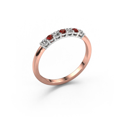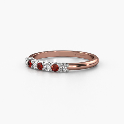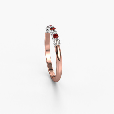 Deze 7 steens ring heeft de naam Michelle 7. Dit type ring wordt een 'alliance' ring genoemd, omdat hij recht is uitgevoerd. Hierdoor kan de ring samen met andere ringen gedragen worden. Deze ring is uitgevoerd in 14 Carat rosé goud en heeft granaat in combinatie met diamant ter grootte van 2 mm in de band. Zoals je ziet, worden er bij deze prachtige rosé gouden alliance ring granaat naast elkaar op de ring gezet. De betekenis van alliance is letterlijk 'samenwerken'. En dat is precies wat deze edelstenen doen: samen creëren ze op de band een extra bijzonder effect bij een klassieke ring! Een prachtige symboliek voor een ring, toch? Alle zorgvuldig geselecteerde granaat worden met de hand geplaatst door onze meester goudsmid. Een zeer precies werkje, dat alleen door onze unieke combinatie van puur vakmanschap en de modernste technieken het optimale effect krijgt. Alle edelstenen moeten namelijk precies op dezelfde manier geplaatst worden om het licht perfect te verspreiden. Daarom zal de goudsmid deze ring steeds weer tegen het licht houden om te zien of de granaat juist geplaatst zijn. Het vraagt een vaardige hand en veel geduld, maar het resultaat is een echt meesterstuk. En daar gaan we voor!Met veel passie gaan onze edelsmeden met jouw ring aan de slag in ons atelier, zodra je deze besteld hebt. Doordat we geen sieraden op voorraad hebben, hoeven we de voorraad niet door te berekenen in de prijs. En dat zie je terug in de prijs! We geven je graag een beste prijsgarantie.