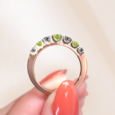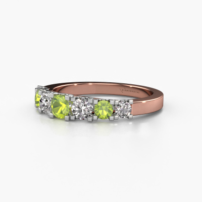 Deze 7 steens ring heeft de naam Selina 3. Dit type ring wordt een 'alliance' ring genoemd, omdat hij recht is uitgevoerd. Hierdoor kan de ring samen met andere ringen gedragen worden. Deze ring is uitgevoerd in 14 Carat rosé goud en heeft peridoot in combinatie met diamant ter grootte van 3.7 mm in de band. Zoals je ziet, worden er bij deze prachtige rosé gouden alliance ring peridoot naast elkaar op de ring gezet. De betekenis van alliance is letterlijk 'samenwerken'. En dat is precies wat deze edelstenen doen: samen creëren ze op de band een extra bijzonder effect bij een moderne ring! Een prachtige symboliek voor een ring, toch? Alle zorgvuldig geselecteerde peridoot worden met de hand geplaatst door onze meester goudsmid. Een zeer precies werkje, dat alleen door onze unieke combinatie van puur vakmanschap en de modernste technieken het optimale effect krijgt. Alle edelstenen moeten namelijk precies op dezelfde manier geplaatst worden om het licht perfect te verspreiden. Daarom zal de goudsmid deze ring steeds weer tegen het licht houden om te zien of de peridoot juist geplaatst zijn. Het vraagt een vaardige hand en veel geduld, maar het resultaat is een echt meesterstuk. En daar gaan we voor!Omdat wij zelf alle sieraden maken en direct aan jou leveren, kunnen wij je een ring leveren tegen een prijs die je nergens anders zult tegenkomen. Een ring wordt pas gemaakt als we een bestelling krijgen, hierdoor hebben wij geen dure voorraden en kunnen wij jou de beste prijs garanderen. Wij begrijpen dat het kopen van een sieraad online spannend is, en denken graag met je mee over de mogelijkheden binnen jouw budget.Elke dag worden nieuwe ring ontwerpen toegevoegd aan de site door ons team van talentvolle en gepassioneerde ontwerpers. Hierbij wordt ernaar gestreefd om een zo gevarieerd mogelijke collectie aan te bieden. Heb je bepaalde ideeën voor een ring, neem dan eens contact op voor een offerte. Wij doen je een aanbod wat betreft prijs en kwaliteit waar je geen nee tegen zult kunnen zeggen.Om het voor jou makkelijker te maken kun je ieder besteld sieraad binnen 30 dagen na aflevering eenvoudig weer retour sturen.'