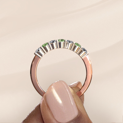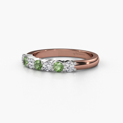 Deze 7 steens ring heeft de naam Yasmin 7. Dit type ring wordt een 'alliance' ring genoemd, omdat hij recht is uitgevoerd. Hierdoor kan de ring samen met andere ringen gedragen worden. Deze ring is uitgevoerd in 14 Carat rosé goud en heeft toermalijn groen in combinatie met lab-grown diamant ter grootte van 2.7 mm in de band. Zoals je ziet, worden er bij deze prachtige rosé gouden alliance ring toermalijn groen naast elkaar op de ring gezet. De betekenis van alliance is letterlijk 'samenwerken'. En dat is precies wat deze edelstenen doen: samen creëren ze op de band een extra bijzonder effect bij een klassieke ring! Een prachtige symboliek voor een ring, toch? Alle zorgvuldig geselecteerde toermalijn groen worden met de hand geplaatst door onze meester goudsmid. Een zeer precies werkje, dat alleen door onze unieke combinatie van puur vakmanschap en de modernste technieken het optimale effect krijgt. Alle edelstenen moeten namelijk precies op dezelfde manier geplaatst worden om het licht perfect te verspreiden. Daarom zal de goudsmid deze ring steeds weer tegen het licht houden om te zien of de toermalijn groen juist geplaatst zijn. Het vraagt een vaardige hand en veel geduld, maar het resultaat is een echt meesterstuk. En daar gaan we voor!Met veel passie gaan onze edelsmeden met jouw ring aan de slag in ons atelier, zodra je deze besteld hebt. Doordat we geen sieraden op voorraad hebben, hoeven we de voorraad niet door te berekenen in de prijs. En dat zie je terug in de prijs! We geven je graag een beste prijsgarantie.Elke dag worden nieuwe ring ontwerpen toegevoegd aan de site door ons team van talentvolle en gepassioneerde ontwerpers. Hierbij wordt ernaar gestreefd om een zo gevarieerd mogelijke collectie aan te bieden. Heb je bepaalde ideeën voor een ring, neem dan eens contact op voor een offerte. Wij doen je een aanbod wat betreft prijs en kwaliteit waar je geen nee tegen zult kunnen zeggen.Om het voor jou makkelijker te maken kun je ieder besteld sieraad binnen 30 dagen na aflevering eenvoudig weer retour sturen.'