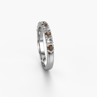 Deze 9 steens ring heeft de naam Rianne 9. Dit type ring wordt een 'alliance' ring genoemd, omdat hij recht is uitgevoerd. Hierdoor kan de ring samen met andere ringen gedragen worden. Deze ring is uitgevoerd in platina en heeft rookkwarts in combinatie met diamant ter grootte van 2.4 mm in de band. Zoals je ziet, worden er bij deze prachtige platina alliance ring rookkwarts naast elkaar op de ring gezet. De betekenis van alliance is letterlijk 'samenwerken'. En dat is precies wat deze edelstenen doen: samen creëren ze op de band een extra bijzonder effect bij een klassieke ring! Een prachtige symboliek voor een ring, toch? Alle zorgvuldig geselecteerde rookkwarts worden met de hand geplaatst door onze meester goudsmid. Een zeer precies werkje, dat alleen door onze unieke combinatie van puur vakmanschap en de modernste technieken het optimale effect krijgt. Alle edelstenen moeten namelijk precies op dezelfde manier geplaatst worden om het licht perfect te verspreiden. Daarom zal de goudsmid deze ring steeds weer tegen het licht houden om te zien of de rookkwarts juist geplaatst zijn. Het vraagt een vaardige hand en veel geduld, maar het resultaat is een echt meesterstuk. En daar gaan we voor!Ben je gebonden aan een bepaald budget? Neem gerust contact met ons op, we adviseren graag over alle mogelijkheden. Sowieso leveren wij alle ringen tegen een prijs die je nergens anders tegen komt, doordat we de ring pas vervaardigen wanneer je deze besteld. Hierdoor kunnen wij je een beste prijs garantie geven.