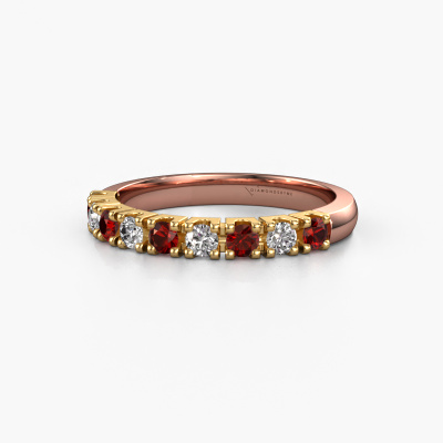 Deze 9 steens ring heeft de naam Rianne 9. Dit type ring wordt een 'alliance' ring genoemd, omdat hij recht is uitgevoerd. Hierdoor kan de ring samen met andere ringen gedragen worden. Deze ring is uitgevoerd in 14 Carat rosé goud en heeft granaat in combinatie met diamant ter grootte van 2.4 mm in de band. Zoals je ziet, worden er bij deze prachtige rosé gouden alliance ring granaat naast elkaar op de ring gezet. De betekenis van alliance is letterlijk 'samenwerken'. En dat is precies wat deze edelstenen doen: samen creëren ze op de band een extra bijzonder effect bij een klassieke ring! Een prachtige symboliek voor een ring, toch? Alle zorgvuldig geselecteerde granaat worden met de hand geplaatst door onze meester goudsmid. Een zeer precies werkje, dat alleen door onze unieke combinatie van puur vakmanschap en de modernste technieken het optimale effect krijgt. Alle edelstenen moeten namelijk precies op dezelfde manier geplaatst worden om het licht perfect te verspreiden. Daarom zal de goudsmid deze ring steeds weer tegen het licht houden om te zien of de granaat juist geplaatst zijn. Het vraagt een vaardige hand en veel geduld, maar het resultaat is een echt meesterstuk. En daar gaan we voor!Ben je gebonden aan een bepaald budget? Neem gerust contact met ons op, we adviseren graag over alle mogelijkheden. Sowieso leveren wij alle ringen tegen een prijs die je nergens anders tegen komt, doordat we de ring pas vervaardigen wanneer je deze besteld. Hierdoor kunnen wij je een beste prijs garantie geven.