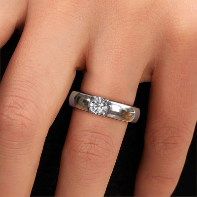 Deze 1 steens ring heeft de naam Rianne 1. Dit type ring wordt een 'alliance' ring genoemd, omdat hij recht is uitgevoerd. Hierdoor kan de ring samen met andere ringen gedragen worden. Deze ring is uitgevoerd in 14 Carat witgoud en heeft 1 diamant ter grootte van 0.50 crt in de band. Zoals je ziet, wordt er bij deze prachtige witgouden alliance ring 1 diamant naast elkaar op de ring gezet. De betekenis van alliance is letterlijk 'samenwerken'. En dat is precies wat deze edelstenen doen: samen creëren ze op de band een extra bijzonder effect bij een klassieke ring! Een prachtige symboliek voor een ring, toch? Alle zorgvuldig geselecteerde diamanten worden met de hand geplaatst door onze meester goudsmid. Een zeer precies werkje, dat alleen door onze unieke combinatie van puur vakmanschap en de modernste technieken het optimale effect krijgt. Alle edelstenen moeten namelijk precies op dezelfde manier geplaatst worden om het licht perfect te verspreiden. Daarom zal de goudsmid deze ring steeds weer tegen het licht houden om te zien of de diamanten juist geplaatst zijn. Het vraagt een vaardige hand en veel geduld, maar het resultaat is een echt meesterstuk. En daar gaan we voor!Door het gebruik van de modernste technieken, gecombineerd met ambachtelijk vakmanschap kunnen wij alle ringen zelf in ons atelier maken. Iedere ring wordt pas gemaakt nadat deze besteld is. Dit heeft als bijkomend voordeel dat we kunnen leveren tegen een prijs die je nergens anders tegenkomt.Elke dag worden nieuwe ring ontwerpen toegevoegd aan de site door ons team van talentvolle en gepassioneerde ontwerpers. Hierbij wordt ernaar gestreefd om een zo gevarieerd mogelijke collectie aan te bieden. Heb je bepaalde ideeën voor een ring, neem dan eens contact op voor een offerte. Wij doen je een aanbod wat betreft prijs en kwaliteit waar je geen nee tegen zult kunnen zeggen.Om het voor jou makkelijker te maken kun je ieder besteld sieraad binnen 30 dagen na aflevering eenvoudig weer retour sturen.'