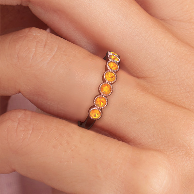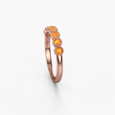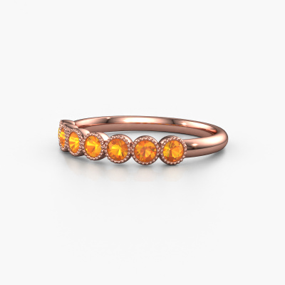 Deze alliance ring heeft de naam Mariam half. Dit type ring wordt een 'alliance' ring genoemd, omdat hij recht is uitgevoerd. Hierdoor kan de ring samen met andere ringen gedragen worden. Deze ring is uitgevoerd in 14 Carat rosé goud en heeft 1 citrien ter grootte van 2.4 mm in de band. Zoals je ziet, wordt er bij deze prachtige rosé gouden alliance ring 1 citrien naast elkaar op de ring gezet. De betekenis van alliance is letterlijk 'samenwerken'. En dat is precies wat deze edelstenen doen: samen creëren ze op de band een extra bijzonder effect bij een fantasie ring! Een prachtige symboliek voor een ring, toch? Alle zorgvuldig geselecteerde citrien worden met de hand geplaatst door onze meester goudsmid. Een zeer precies werkje, dat alleen door onze unieke combinatie van puur vakmanschap en de modernste technieken het optimale effect krijgt. Alle edelstenen moeten namelijk precies op dezelfde manier geplaatst worden om het licht perfect te verspreiden. Daarom zal de goudsmid deze ring steeds weer tegen het licht houden om te zien of de citrien juist geplaatst zijn. Het vraagt een vaardige hand en veel geduld, maar het resultaat is een echt meesterstuk. En daar gaan we voor!Ben je gebonden aan een bepaald budget? Neem gerust contact met ons op, we adviseren graag over alle mogelijkheden. Sowieso leveren wij alle ringen tegen een prijs die je nergens anders tegen komt, doordat we de ring pas vervaardigen wanneer je deze besteld. Hierdoor kunnen wij je een beste prijs garantie geven.
