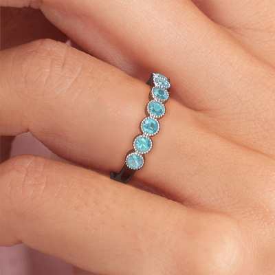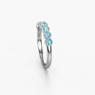 Deze alliance ring heeft de naam Mariam half. Dit type ring wordt een 'alliance' ring genoemd, omdat hij recht is uitgevoerd. Hierdoor kan de ring samen met andere ringen gedragen worden. Deze ring is uitgevoerd in 14 Carat witgoud en heeft 1 blauw topaas ter grootte van 2.4 mm in de band. Zoals je ziet, wordt er bij deze prachtige witgouden alliance ring 1 blauw topaas naast elkaar op de ring gezet. De betekenis van alliance is letterlijk 'samenwerken'. En dat is precies wat deze edelstenen doen: samen creëren ze op de band een extra bijzonder effect bij een fantasie ring! Een prachtige symboliek voor een ring, toch? Alle zorgvuldig geselecteerde blauw topaas worden met de hand geplaatst door onze meester goudsmid. Een zeer precies werkje, dat alleen door onze unieke combinatie van puur vakmanschap en de modernste technieken het optimale effect krijgt. Alle edelstenen moeten namelijk precies op dezelfde manier geplaatst worden om het licht perfect te verspreiden. Daarom zal de goudsmid deze ring steeds weer tegen het licht houden om te zien of de blauw topaas juist geplaatst zijn. Het vraagt een vaardige hand en veel geduld, maar het resultaat is een echt meesterstuk. En daar gaan we voor!Ben je gebonden aan een bepaald budget? Neem gerust contact met ons op, we adviseren graag over alle mogelijkheden. Sowieso leveren wij alle ringen tegen een prijs die je nergens anders tegen komt, doordat we de ring pas vervaardigen wanneer je deze besteld. Hierdoor kunnen wij je een beste prijs garantie geven.