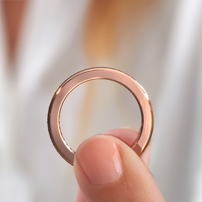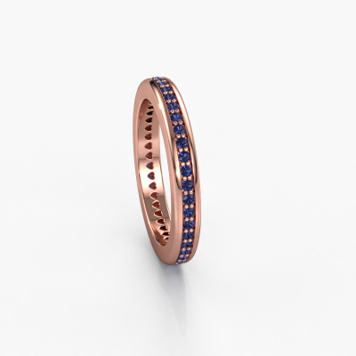 Deze eternity aanschuifring heeft de naam Elvire 3. Dit type aanschuifring wordt een 'alliance' aanschuifring genoemd, omdat hij recht is uitgevoerd. Hierdoor kan de aanschuifring samen met andere ringen gedragen worden. Deze aanschuifring is uitgevoerd in 14 Carat rosé goud en heeft 1 saffier ter grootte van 1.3 mm in de band. Zoals je ziet, wordt er bij deze prachtige rosé gouden alliance aanschuifring 1 saffier naast elkaar op de aanschuifring gezet. De betekenis van alliance is letterlijk 'samenwerken'. En dat is precies wat deze edelstenen doen: samen creëren ze op de band een extra bijzonder effect bij een moderne ring! Een prachtige symboliek voor een ring, toch? Alle zorgvuldig geselecteerde saffier worden met de hand geplaatst door onze meester goudsmid. Een zeer precies werkje, dat alleen door onze unieke combinatie van puur vakmanschap en de modernste technieken het optimale effect krijgt. Alle edelstenen moeten namelijk precies op dezelfde manier geplaatst worden om het licht perfect te verspreiden. Daarom zal de goudsmid deze aanschuifring steeds weer tegen het licht houden om te zien of de saffier juist geplaatst zijn. Het vraagt een vaardige hand en veel geduld, maar het resultaat is een echt meesterstuk. En daar gaan we voor!Door het gebruik van de modernste technieken, gecombineerd met ambachtelijk vakmanschap kunnen wij alle ringen zelf in ons atelier maken. Iedere ring wordt pas gemaakt nadat deze besteld is. Dit heeft als bijkomend voordeel dat we kunnen leveren tegen een prijs die je nergens anders tegenkomt.Elke dag worden nieuwe ring ontwerpen toegevoegd aan de site door ons team van talentvolle en gepassioneerde ontwerpers. Hierbij wordt ernaar gestreefd om een zo gevarieerd mogelijke collectie aan te bieden. Heb je bepaalde ideeën voor een ring, neem dan eens contact op voor een offerte. Wij doen je een aanbod wat betreft prijs en kwaliteit waar je geen nee tegen zult kunnen zeggen.Om het voor jou makkelijker te maken kun je ieder besteld sieraad binnen 30 dagen na aflevering eenvoudig weer retour sturen.'