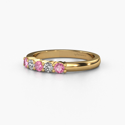 Deze 5 steens ring heeft de naam Yasmin 5. Dit type ring wordt een 'alliance' ring genoemd, omdat hij recht is uitgevoerd. Hierdoor kan de ring samen met andere ringen gedragen worden. Deze ring is uitgevoerd in 14 Carat goud en heeft roze saffier in combinatie met diamant ter grootte van 3 mm in de band. Zoals je ziet, worden er bij deze prachtige gouden alliance ring roze saffier naast elkaar op de ring gezet. De betekenis van alliance is letterlijk 'samenwerken'. En dat is precies wat deze edelstenen doen: samen creëren ze op de band een extra bijzonder effect bij een klassieke ring! Een prachtige symboliek voor een ring, toch? Alle zorgvuldig geselecteerde roze saffier worden met de hand geplaatst door onze meester goudsmid. Een zeer precies werkje, dat alleen door onze unieke combinatie van puur vakmanschap en de modernste technieken het optimale effect krijgt. Alle edelstenen moeten namelijk precies op dezelfde manier geplaatst worden om het licht perfect te verspreiden. Daarom zal de goudsmid deze ring steeds weer tegen het licht houden om te zien of de roze saffier juist geplaatst zijn. Het vraagt een vaardige hand en veel geduld, maar het resultaat is een echt meesterstuk. En daar gaan we voor!Met veel passie gaan onze edelsmeden met jouw ring aan de slag in ons atelier, zodra je deze besteld hebt. Doordat we geen sieraden op voorraad hebben, hoeven we de voorraad niet door te berekenen in de prijs. En dat zie je terug in de prijs! We geven je graag een beste prijsgarantie.Onze talentvolle ontwerpers voegen elke dag nieuwe designs toe aan de website, en werken samen om tot een zo gevarieerd mogelijke collectie te komen met de mooiste sieraden. Wil je een ring laten maken naar eigen ontwerp, neem dan eens contact met ons op voor een offerte. Graag doen wij je een aanbod, waarvan wij denken dat je wat betreft kwaliteit en prijs versteld zult staan.Om het voor jou makkelijker te maken kun je ieder besteld sieraad binnen 30 dagen na aflevering eenvoudig weer retour sturen.'