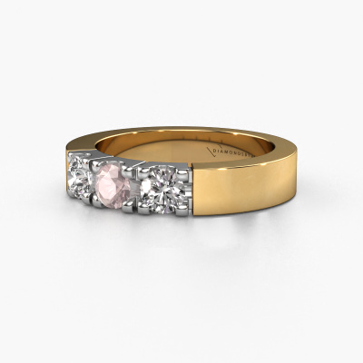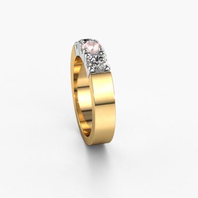 Deze 3 steens ring heeft de naam Dana 3. Dit type ring wordt een 'alliance' ring genoemd, omdat hij recht is uitgevoerd. Hierdoor kan de ring samen met andere ringen gedragen worden. Deze ring is uitgevoerd in 14 Carat goud en heeft morganiet champagne in combinatie met lab-grown diamant ter grootte van 4 mm in de band. Zoals je ziet, worden er bij deze prachtige gouden alliance ring morganiet champagne naast elkaar op de ring gezet. De betekenis van alliance is letterlijk 'samenwerken'. En dat is precies wat deze edelstenen doen: samen creëren ze op de band een extra bijzonder effect bij een moderne ring! Een prachtige symboliek voor een ring, toch? Alle zorgvuldig geselecteerde morganiet champagne worden met de hand geplaatst door onze meester goudsmid. Een zeer precies werkje, dat alleen door onze unieke combinatie van puur vakmanschap en de modernste technieken het optimale effect krijgt. Alle edelstenen moeten namelijk precies op dezelfde manier geplaatst worden om het licht perfect te verspreiden. Daarom zal de goudsmid deze ring steeds weer tegen het licht houden om te zien of de morganiet champagne juist geplaatst zijn. Het vraagt een vaardige hand en veel geduld, maar het resultaat is een echt meesterstuk. En daar gaan we voor!Met veel passie gaan onze edelsmeden met jouw ring aan de slag in ons atelier, zodra je deze besteld hebt. Doordat we geen sieraden op voorraad hebben, hoeven we de voorraad niet door te berekenen in de prijs. En dat zie je terug in de prijs! We geven je graag een beste prijsgarantie.Onze talentvolle ontwerpers voegen elke dag nieuwe designs toe aan de website, en werken samen om tot een zo gevarieerd mogelijke collectie te komen met de mooiste sieraden. Wil je een ring laten maken naar eigen ontwerp, neem dan eens contact met ons op voor een offerte. Graag doen wij je een aanbod, waarvan wij denken dat je wat betreft kwaliteit en prijs versteld zult staan.Om het voor jou makkelijker te maken kun je ieder besteld sieraad binnen 30 dagen na aflevering eenvoudig weer retour sturen.'