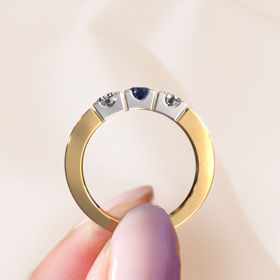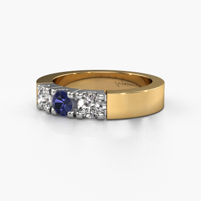 Deze 3 steens ring heeft de naam Dana 3. Dit type ring wordt een 'alliance' ring genoemd, omdat hij recht is uitgevoerd. Hierdoor kan de ring samen met andere ringen gedragen worden. Deze ring is uitgevoerd in 14 Carat goud en heeft saffier in combinatie met lab-grown diamant ter grootte van 4 mm in de band. Zoals je ziet, worden er bij deze prachtige gouden alliance ring saffier naast elkaar op de ring gezet. De betekenis van alliance is letterlijk 'samenwerken'. En dat is precies wat deze edelstenen doen: samen creëren ze op de band een extra bijzonder effect bij een moderne ring! Een prachtige symboliek voor een ring, toch? Alle zorgvuldig geselecteerde saffier worden met de hand geplaatst door onze meester goudsmid. Een zeer precies werkje, dat alleen door onze unieke combinatie van puur vakmanschap en de modernste technieken het optimale effect krijgt. Alle edelstenen moeten namelijk precies op dezelfde manier geplaatst worden om het licht perfect te verspreiden. Daarom zal de goudsmid deze ring steeds weer tegen het licht houden om te zien of de saffier juist geplaatst zijn. Het vraagt een vaardige hand en veel geduld, maar het resultaat is een echt meesterstuk. En daar gaan we voor!Met veel passie gaan onze edelsmeden met jouw ring aan de slag in ons atelier, zodra je deze besteld hebt. Doordat we geen sieraden op voorraad hebben, hoeven we de voorraad niet door te berekenen in de prijs. En dat zie je terug in de prijs! We geven je graag een beste prijsgarantie.Onze talentvolle ontwerpers voegen elke dag nieuwe designs toe aan de website, en werken samen om tot een zo gevarieerd mogelijke collectie te komen met de mooiste sieraden. Wil je een ring laten maken naar eigen ontwerp, neem dan eens contact met ons op voor een offerte. Graag doen wij je een aanbod, waarvan wij denken dat je wat betreft kwaliteit en prijs versteld zult staan.Om het voor jou makkelijker te maken kun je ieder besteld sieraad binnen 30 dagen na aflevering eenvoudig weer retour sturen.'