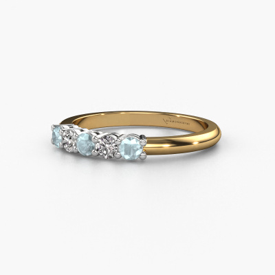 Deze 5 steens ring heeft de naam Michelle 5. Dit type ring wordt een 'alliance' ring genoemd, omdat hij recht is uitgevoerd. Hierdoor kan de ring samen met andere ringen gedragen worden. Deze ring is uitgevoerd in 14 Carat goud en heeft aquamarijn in combinatie met lab-grown diamant ter grootte van 3 mm in de band. Zoals je ziet, worden er bij deze prachtige gouden alliance ring aquamarijn naast elkaar op de ring gezet. De betekenis van alliance is letterlijk 'samenwerken'. En dat is precies wat deze edelstenen doen: samen creëren ze op de band een extra bijzonder effect bij een klassieke ring! Een prachtige symboliek voor een ring, toch? Alle zorgvuldig geselecteerde aquamarijn worden met de hand geplaatst door onze meester goudsmid. Een zeer precies werkje, dat alleen door onze unieke combinatie van puur vakmanschap en de modernste technieken het optimale effect krijgt. Alle edelstenen moeten namelijk precies op dezelfde manier geplaatst worden om het licht perfect te verspreiden. Daarom zal de goudsmid deze ring steeds weer tegen het licht houden om te zien of de aquamarijn juist geplaatst zijn. Het vraagt een vaardige hand en veel geduld, maar het resultaat is een echt meesterstuk. En daar gaan we voor!Ben je gebonden aan een bepaald budget? Neem gerust contact met ons op, we adviseren graag over alle mogelijkheden. Sowieso leveren wij alle ringen tegen een prijs die je nergens anders tegen komt, doordat we de ring pas vervaardigen wanneer je deze besteld. Hierdoor kunnen wij je een beste prijs garantie geven.