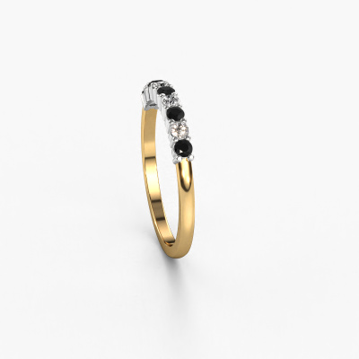 Deze 9 steens ring heeft de naam Yasmin 9. Dit type ring wordt een 'alliance' ring genoemd, omdat hij recht is uitgevoerd. Hierdoor kan de ring samen met andere ringen gedragen worden. Deze ring is uitgevoerd in 14 Carat goud en heeft zwarte diamant in combinatie met diamant ter grootte van 0.066 crt in de band. Zoals je ziet, worden er bij deze prachtige gouden alliance ring zwarte diamanten naast elkaar op de ring gezet. De betekenis van alliance is letterlijk 'samenwerken'. En dat is precies wat deze edelstenen doen: samen creëren ze op de band een extra bijzonder effect bij een klassieke ring! Een prachtige symboliek voor een ring, toch? Alle zorgvuldig geselecteerde zwarte diamanten worden met de hand geplaatst door onze meester goudsmid. Een zeer precies werkje, dat alleen door onze unieke combinatie van puur vakmanschap en de modernste technieken het optimale effect krijgt. Alle edelstenen moeten namelijk precies op dezelfde manier geplaatst worden om het licht perfect te verspreiden. Daarom zal de goudsmid deze ring steeds weer tegen het licht houden om te zien of de zwarte diamanten juist geplaatst zijn. Het vraagt een vaardige hand en veel geduld, maar het resultaat is een echt meesterstuk. En daar gaan we voor!Door het gebruik van de modernste technieken, gecombineerd met ambachtelijk vakmanschap kunnen wij alle ringen zelf in ons atelier maken. Iedere ring wordt pas gemaakt nadat deze besteld is. Dit heeft als bijkomend voordeel dat we kunnen leveren tegen een prijs die je nergens anders tegenkomt.Elke dag worden nieuwe ring ontwerpen toegevoegd aan de site door ons team van talentvolle en gepassioneerde ontwerpers. Hierbij wordt ernaar gestreefd om een zo gevarieerd mogelijke collectie aan te bieden. Heb je bepaalde ideeën voor een ring, neem dan eens contact op voor een offerte. Wij doen je een aanbod wat betreft prijs en kwaliteit waar je geen nee tegen zult kunnen zeggen.Om het voor jou makkelijker te maken kun je ieder besteld sieraad binnen 30 dagen na aflevering eenvoudig weer retour sturen.'