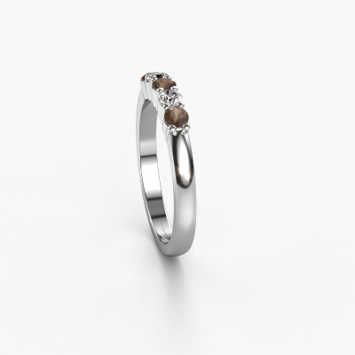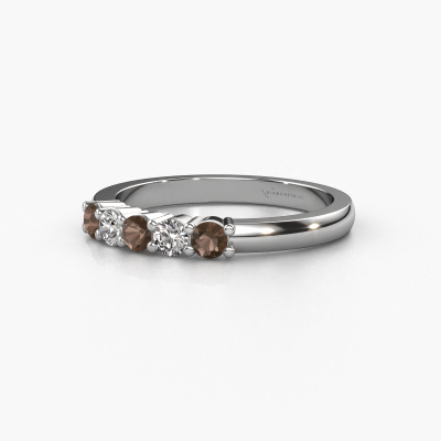 Deze 5 steens ring heeft de naam Yasmin 5. Dit type ring wordt een 'alliance' ring genoemd, omdat hij recht is uitgevoerd. Hierdoor kan de ring samen met andere ringen gedragen worden. Deze ring is uitgevoerd in platina en heeft rookkwarts in combinatie met diamant ter grootte van 3 mm in de band. Zoals je ziet, worden er bij deze prachtige platina alliance ring rookkwarts naast elkaar op de ring gezet. De betekenis van alliance is letterlijk 'samenwerken'. En dat is precies wat deze edelstenen doen: samen creëren ze op de band een extra bijzonder effect bij een klassieke ring! Een prachtige symboliek voor een ring, toch? Alle zorgvuldig geselecteerde rookkwarts worden met de hand geplaatst door onze meester goudsmid. Een zeer precies werkje, dat alleen door onze unieke combinatie van puur vakmanschap en de modernste technieken het optimale effect krijgt. Alle edelstenen moeten namelijk precies op dezelfde manier geplaatst worden om het licht perfect te verspreiden. Daarom zal de goudsmid deze ring steeds weer tegen het licht houden om te zien of de rookkwarts juist geplaatst zijn. Het vraagt een vaardige hand en veel geduld, maar het resultaat is een echt meesterstuk. En daar gaan we voor!Met veel passie gaan onze edelsmeden met jouw ring aan de slag in ons atelier, zodra je deze besteld hebt. Doordat we geen sieraden op voorraad hebben, hoeven we de voorraad niet door te berekenen in de prijs. En dat zie je terug in de prijs! We geven je graag een beste prijsgarantie.Onze talentvolle ontwerpers voegen elke dag nieuwe designs toe aan de website, en werken samen om tot een zo gevarieerd mogelijke collectie te komen met de mooiste sieraden. Wil je een ring laten maken naar eigen ontwerp, neem dan eens contact met ons op voor een offerte. Graag doen wij je een aanbod, waarvan wij denken dat je wat betreft kwaliteit en prijs versteld zult staan.Om het voor jou makkelijker te maken kun je ieder besteld sieraad binnen 30 dagen na aflevering eenvoudig weer retour sturen.'