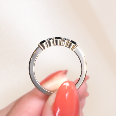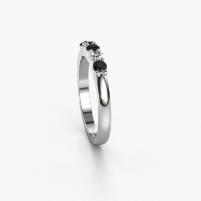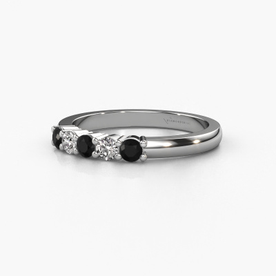 Deze 5 steens ring heeft de naam Yasmin 5. Dit type ring wordt een 'alliance' ring genoemd, omdat hij recht is uitgevoerd. Hierdoor kan de ring samen met andere ringen gedragen worden. Deze ring is uitgevoerd in platina en heeft zwarte diamant in combinatie met diamant ter grootte van 0.12 crt in de band. Zoals je ziet, worden er bij deze prachtige platina alliance ring zwarte diamanten naast elkaar op de ring gezet. De betekenis van alliance is letterlijk 'samenwerken'. En dat is precies wat deze edelstenen doen: samen creëren ze op de band een extra bijzonder effect bij een klassieke ring! Een prachtige symboliek voor een ring, toch? Alle zorgvuldig geselecteerde zwarte diamanten worden met de hand geplaatst door onze meester goudsmid. Een zeer precies werkje, dat alleen door onze unieke combinatie van puur vakmanschap en de modernste technieken het optimale effect krijgt. Alle edelstenen moeten namelijk precies op dezelfde manier geplaatst worden om het licht perfect te verspreiden. Daarom zal de goudsmid deze ring steeds weer tegen het licht houden om te zien of de zwarte diamanten juist geplaatst zijn. Het vraagt een vaardige hand en veel geduld, maar het resultaat is een echt meesterstuk. En daar gaan we voor!Met veel passie gaan onze edelsmeden met jouw ring aan de slag in ons atelier, zodra je deze besteld hebt. Doordat we geen sieraden op voorraad hebben, hoeven we de voorraad niet door te berekenen in de prijs. En dat zie je terug in de prijs! We geven je graag een beste prijsgarantie.Onze talentvolle ontwerpers voegen elke dag nieuwe designs toe aan de website, en werken samen om tot een zo gevarieerd mogelijke collectie te komen met de mooiste sieraden. Wil je een ring laten maken naar eigen ontwerp, neem dan eens contact met ons op voor een offerte. Graag doen wij je een aanbod, waarvan wij denken dat je wat betreft kwaliteit en prijs versteld zult staan.Om het voor jou makkelijker te maken kun je ieder besteld sieraad binnen 30 dagen na aflevering eenvoudig weer retour sturen.'