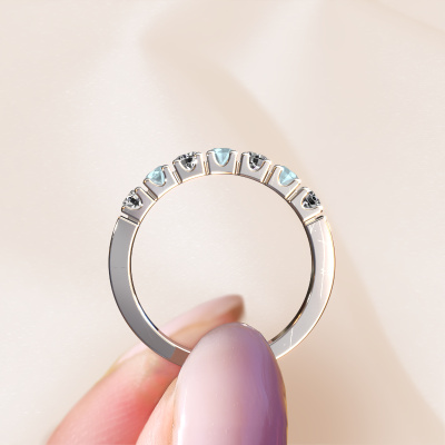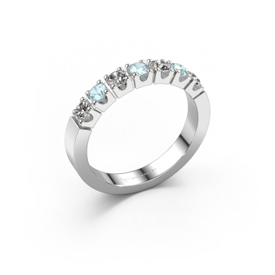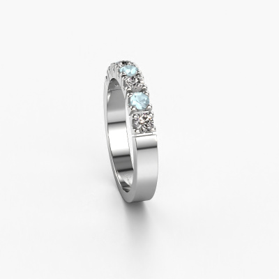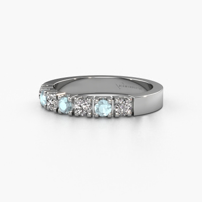 Deze 7 steens ring heeft de naam Dana 7. Dit type ring wordt een 'alliance' ring genoemd, omdat hij recht is uitgevoerd. Hierdoor kan de ring samen met andere ringen gedragen worden. Deze ring is uitgevoerd in platina en heeft aquamarijn in combinatie met lab-grown diamant ter grootte van 3 mm in de band. Zoals je ziet, worden er bij deze prachtige platina alliance ring aquamarijn naast elkaar op de ring gezet. De betekenis van alliance is letterlijk 'samenwerken'. En dat is precies wat deze edelstenen doen: samen creëren ze op de band een extra bijzonder effect bij een moderne ring! Een prachtige symboliek voor een ring, toch? Alle zorgvuldig geselecteerde aquamarijn worden met de hand geplaatst door onze meester goudsmid. Een zeer precies werkje, dat alleen door onze unieke combinatie van puur vakmanschap en de modernste technieken het optimale effect krijgt. Alle edelstenen moeten namelijk precies op dezelfde manier geplaatst worden om het licht perfect te verspreiden. Daarom zal de goudsmid deze ring steeds weer tegen het licht houden om te zien of de aquamarijn juist geplaatst zijn. Het vraagt een vaardige hand en veel geduld, maar het resultaat is een echt meesterstuk. En daar gaan we voor!Met veel passie gaan onze edelsmeden met jouw ring aan de slag in ons atelier, zodra je deze besteld hebt. Doordat we geen sieraden op voorraad hebben, hoeven we de voorraad niet door te berekenen in de prijs. En dat zie je terug in de prijs! We geven je graag een beste prijsgarantie.Elke dag worden nieuwe ring ontwerpen toegevoegd aan de site door ons team van talentvolle en gepassioneerde ontwerpers. Hierbij wordt ernaar gestreefd om een zo gevarieerd mogelijke collectie aan te bieden. Heb je bepaalde ideeën voor een ring, neem dan eens contact op voor een offerte. Wij doen je een aanbod wat betreft prijs en kwaliteit waar je geen nee tegen zult kunnen zeggen.Om het voor jou makkelijker te maken kun je ieder besteld sieraad binnen 30 dagen na aflevering eenvoudig weer retour sturen.'