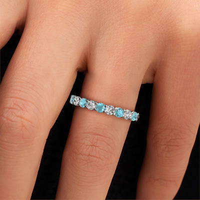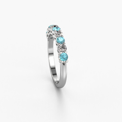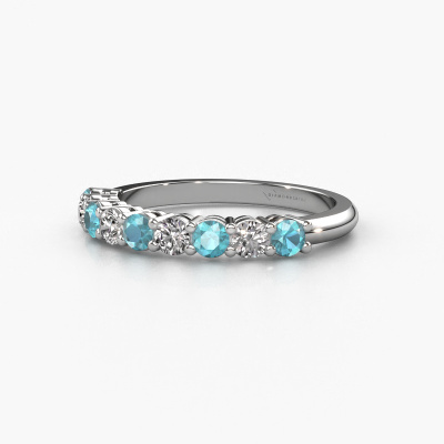 Deze 9 steens ring heeft de naam Michelle 9. Dit type ring wordt een 'alliance' ring genoemd, omdat hij recht is uitgevoerd. Hierdoor kan de ring samen met andere ringen gedragen worden. Deze ring is uitgevoerd in platina en heeft blauw topaas in combinatie met lab-grown diamant ter grootte van 2.7 mm in de band. Zoals je ziet, worden er bij deze prachtige platina alliance ring blauw topaas naast elkaar op de ring gezet. De betekenis van alliance is letterlijk 'samenwerken'. En dat is precies wat deze edelstenen doen: samen creëren ze op de band een extra bijzonder effect bij een klassieke ring! Een prachtige symboliek voor een ring, toch? Alle zorgvuldig geselecteerde blauw topaas worden met de hand geplaatst door onze meester goudsmid. Een zeer precies werkje, dat alleen door onze unieke combinatie van puur vakmanschap en de modernste technieken het optimale effect krijgt. Alle edelstenen moeten namelijk precies op dezelfde manier geplaatst worden om het licht perfect te verspreiden. Daarom zal de goudsmid deze ring steeds weer tegen het licht houden om te zien of de blauw topaas juist geplaatst zijn. Het vraagt een vaardige hand en veel geduld, maar het resultaat is een echt meesterstuk. En daar gaan we voor!Omdat wij zelf alle sieraden maken en direct aan jou leveren, kunnen wij je een ring leveren tegen een prijs die je nergens anders zult tegenkomen. Een ring wordt pas gemaakt als we een bestelling krijgen, hierdoor hebben wij geen dure voorraden en kunnen wij jou de beste prijs garanderen. Wij begrijpen dat het kopen van een sieraad online spannend is, en denken graag met je mee over de mogelijkheden binnen jouw budget.Elke dag worden nieuwe ring ontwerpen toegevoegd aan de site door ons team van talentvolle en gepassioneerde ontwerpers. Hierbij wordt ernaar gestreefd om een zo gevarieerd mogelijke collectie aan te bieden. Heb je bepaalde ideeën voor een ring, neem dan eens contact op voor een offerte. Wij doen je een aanbod wat betreft prijs en kwaliteit waar je geen nee tegen zult kunnen zeggen.Om het voor jou makkelijker te maken kun je ieder besteld sieraad binnen 30 dagen na aflevering eenvoudig weer retour sturen.'