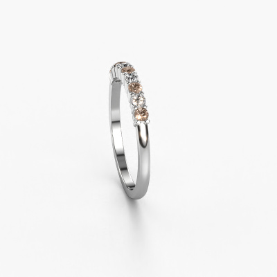 Deze 9 steens ring heeft de naam Yasmin 9. Dit type ring wordt een 'alliance' ring genoemd, omdat hij recht is uitgevoerd. Hierdoor kan de ring samen met andere ringen gedragen worden. Deze ring is uitgevoerd in platina en heeft bruine diamant in combinatie met diamant ter grootte van 0.055 crt in de band. Zoals je ziet, worden er bij deze prachtige platina alliance ring bruine diamanten naast elkaar op de ring gezet. De betekenis van alliance is letterlijk 'samenwerken'. En dat is precies wat deze edelstenen doen: samen creëren ze op de band een extra bijzonder effect bij een klassieke ring! Een prachtige symboliek voor een ring, toch? Alle zorgvuldig geselecteerde bruine diamanten worden met de hand geplaatst door onze meester goudsmid. Een zeer precies werkje, dat alleen door onze unieke combinatie van puur vakmanschap en de modernste technieken het optimale effect krijgt. Alle edelstenen moeten namelijk precies op dezelfde manier geplaatst worden om het licht perfect te verspreiden. Daarom zal de goudsmid deze ring steeds weer tegen het licht houden om te zien of de bruine diamanten juist geplaatst zijn. Het vraagt een vaardige hand en veel geduld, maar het resultaat is een echt meesterstuk. En daar gaan we voor!Door het gebruik van de modernste technieken, gecombineerd met ambachtelijk vakmanschap kunnen wij alle ringen zelf in ons atelier maken. Iedere ring wordt pas gemaakt nadat deze besteld is. Dit heeft als bijkomend voordeel dat we kunnen leveren tegen een prijs die je nergens anders tegenkomt.Elke dag worden nieuwe ring ontwerpen toegevoegd aan de site door ons team van talentvolle en gepassioneerde ontwerpers. Hierbij wordt ernaar gestreefd om een zo gevarieerd mogelijke collectie aan te bieden. Heb je bepaalde ideeën voor een ring, neem dan eens contact op voor een offerte. Wij doen je een aanbod wat betreft prijs en kwaliteit waar je geen nee tegen zult kunnen zeggen.Om het voor jou makkelijker te maken kun je ieder besteld sieraad binnen 30 dagen na aflevering eenvoudig weer retour sturen.'
