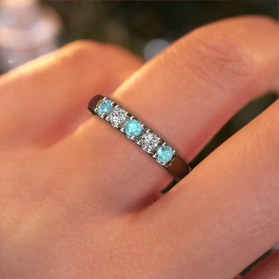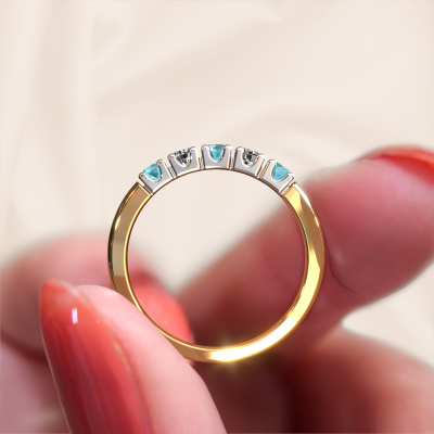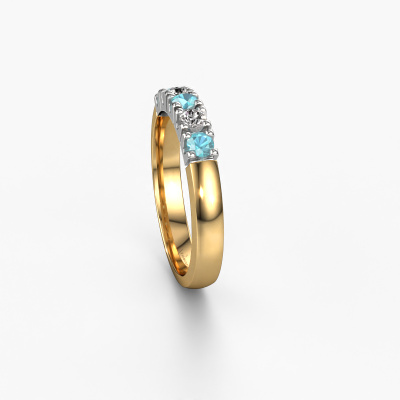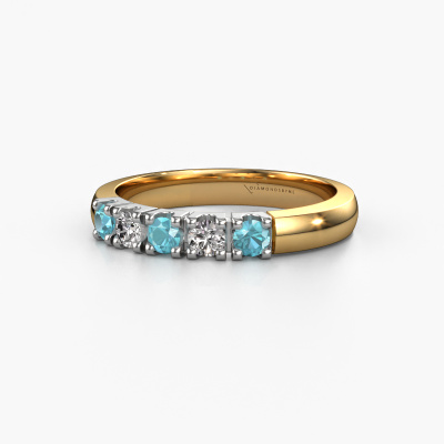 Deze alliance ring heeft de naam Rianne 5. Dit type ring wordt een 'alliance' ring genoemd, omdat hij recht is uitgevoerd. Hierdoor kan de ring samen met andere ringen gedragen worden. Deze ring is uitgevoerd in 14 Carat goud en heeft blauw topaas in combinatie met diamant ter grootte van 2.7 mm in de band. Zoals je ziet, worden er bij deze prachtige gouden alliance ring blauw topaas naast elkaar op de ring gezet. De betekenis van alliance is letterlijk 'samenwerken'. En dat is precies wat deze edelstenen doen: samen creëren ze op de band een extra bijzonder effect bij een klassieke ring! Een prachtige symboliek voor een ring, toch? Alle zorgvuldig geselecteerde blauw topaas worden met de hand geplaatst door onze meester goudsmid. Een zeer precies werkje, dat alleen door onze unieke combinatie van puur vakmanschap en de modernste technieken het optimale effect krijgt. Alle edelstenen moeten namelijk precies op dezelfde manier geplaatst worden om het licht perfect te verspreiden. Daarom zal de goudsmid deze ring steeds weer tegen het licht houden om te zien of de blauw topaas juist geplaatst zijn. Het vraagt een vaardige hand en veel geduld, maar het resultaat is een echt meesterstuk. En daar gaan we voor!Door het gebruik van de modernste technieken, gecombineerd met ambachtelijk vakmanschap kunnen wij alle ringen zelf in ons atelier maken. Iedere ring wordt pas gemaakt nadat deze besteld is. Dit heeft als bijkomend voordeel dat we kunnen leveren tegen een prijs die je nergens anders tegenkomt.