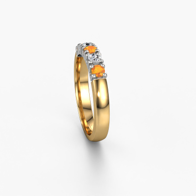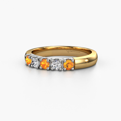 Deze alliance ring heeft de naam Rianne 5. Dit type ring wordt een 'alliance' ring genoemd, omdat hij recht is uitgevoerd. Hierdoor kan de ring samen met andere ringen gedragen worden. Deze ring is uitgevoerd in 14 Carat goud en heeft citrien in combinatie met diamant ter grootte van 2.7 mm in de band. Zoals je ziet, worden er bij deze prachtige gouden alliance ring citrien naast elkaar op de ring gezet. De betekenis van alliance is letterlijk 'samenwerken'. En dat is precies wat deze edelstenen doen: samen creëren ze op de band een extra bijzonder effect bij een klassieke ring! Een prachtige symboliek voor een ring, toch? Alle zorgvuldig geselecteerde citrien worden met de hand geplaatst door onze meester goudsmid. Een zeer precies werkje, dat alleen door onze unieke combinatie van puur vakmanschap en de modernste technieken het optimale effect krijgt. Alle edelstenen moeten namelijk precies op dezelfde manier geplaatst worden om het licht perfect te verspreiden. Daarom zal de goudsmid deze ring steeds weer tegen het licht houden om te zien of de citrien juist geplaatst zijn. Het vraagt een vaardige hand en veel geduld, maar het resultaat is een echt meesterstuk. En daar gaan we voor!Door het gebruik van de modernste technieken, gecombineerd met ambachtelijk vakmanschap kunnen wij alle ringen zelf in ons atelier maken. Iedere ring wordt pas gemaakt nadat deze besteld is. Dit heeft als bijkomend voordeel dat we kunnen leveren tegen een prijs die je nergens anders tegenkomt.