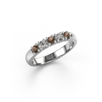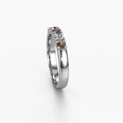 Deze alliance ring heeft de naam Rianne 5. Dit type ring wordt een 'alliance' ring genoemd, omdat hij recht is uitgevoerd. Hierdoor kan de ring samen met andere ringen gedragen worden. Deze ring is uitgevoerd in 14 Carat witgoud en heeft rookkwarts in combinatie met diamant ter grootte van 2.7 mm in de band. Zoals je ziet, worden er bij deze prachtige witgouden alliance ring rookkwarts naast elkaar op de ring gezet. De betekenis van alliance is letterlijk 'samenwerken'. En dat is precies wat deze edelstenen doen: samen creëren ze op de band een extra bijzonder effect bij een klassieke ring! Een prachtige symboliek voor een ring, toch? Alle zorgvuldig geselecteerde rookkwarts worden met de hand geplaatst door onze meester goudsmid. Een zeer precies werkje, dat alleen door onze unieke combinatie van puur vakmanschap en de modernste technieken het optimale effect krijgt. Alle edelstenen moeten namelijk precies op dezelfde manier geplaatst worden om het licht perfect te verspreiden. Daarom zal de goudsmid deze ring steeds weer tegen het licht houden om te zien of de rookkwarts juist geplaatst zijn. Het vraagt een vaardige hand en veel geduld, maar het resultaat is een echt meesterstuk. En daar gaan we voor!Door het gebruik van de modernste technieken, gecombineerd met ambachtelijk vakmanschap kunnen wij alle ringen zelf in ons atelier maken. Iedere ring wordt pas gemaakt nadat deze besteld is. Dit heeft als bijkomend voordeel dat we kunnen leveren tegen een prijs die je nergens anders tegenkomt.