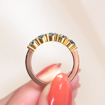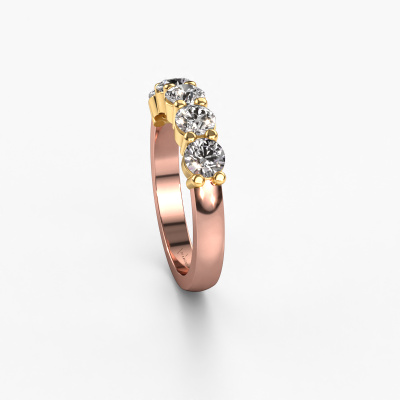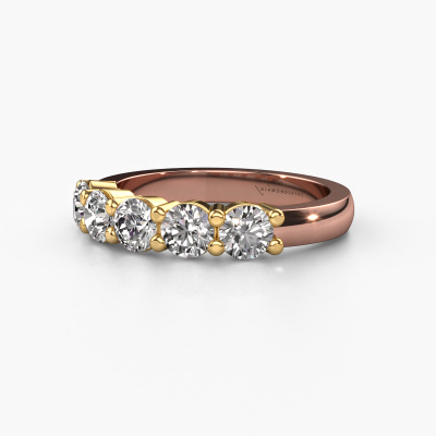 Deze 5 steens ring heeft de naam Yasmin 5. Dit type ring wordt een 'alliance' ring genoemd, omdat hij recht is uitgevoerd. Hierdoor kan de ring samen met andere ringen gedragen worden. Deze ring is uitgevoerd in 14 Carat rosé goud en heeft diamant in combinatie met diamant ter grootte van 0.30 crt in de band. Zoals je ziet, worden er bij deze prachtige rosé gouden alliance ring diamanten naast elkaar op de ring gezet. De betekenis van alliance is letterlijk 'samenwerken'. En dat is precies wat deze edelstenen doen: samen creëren ze op de band een extra bijzonder effect bij een klassieke ring! Een prachtige symboliek voor een ring, toch? Alle zorgvuldig geselecteerde diamanten worden met de hand geplaatst door onze meester goudsmid. Een zeer precies werkje, dat alleen door onze unieke combinatie van puur vakmanschap en de modernste technieken het optimale effect krijgt. Alle edelstenen moeten namelijk precies op dezelfde manier geplaatst worden om het licht perfect te verspreiden. Daarom zal de goudsmid deze ring steeds weer tegen het licht houden om te zien of de diamanten juist geplaatst zijn. Het vraagt een vaardige hand en veel geduld, maar het resultaat is een echt meesterstuk. En daar gaan we voor!Met veel passie gaan onze edelsmeden met jouw ring aan de slag in ons atelier, zodra je deze besteld hebt. Doordat we geen sieraden op voorraad hebben, hoeven we de voorraad niet door te berekenen in de prijs. En dat zie je terug in de prijs! We geven je graag een beste prijsgarantie.Onze talentvolle ontwerpers voegen elke dag nieuwe designs toe aan de website, en werken samen om tot een zo gevarieerd mogelijke collectie te komen met de mooiste sieraden. Wil je een ring laten maken naar eigen ontwerp, neem dan eens contact met ons op voor een offerte. Graag doen wij je een aanbod, waarvan wij denken dat je wat betreft kwaliteit en prijs versteld zult staan.Om het voor jou makkelijker te maken kun je ieder besteld sieraad binnen 30 dagen na aflevering eenvoudig weer retour sturen.'